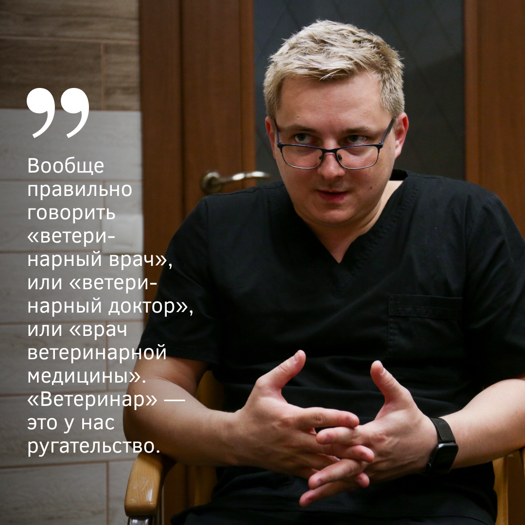 Вообще правильно говорить «ветеринарный врач», или «ветеринарный доктор», или «врач ветеринарной медицины». «Ветеринар» — это у нас ругательство. Это всё от отсутствия престижности нашей профессии в России, в отличие от других стран, где ветеринарный врач — одна из самых уважаемых специальностей.