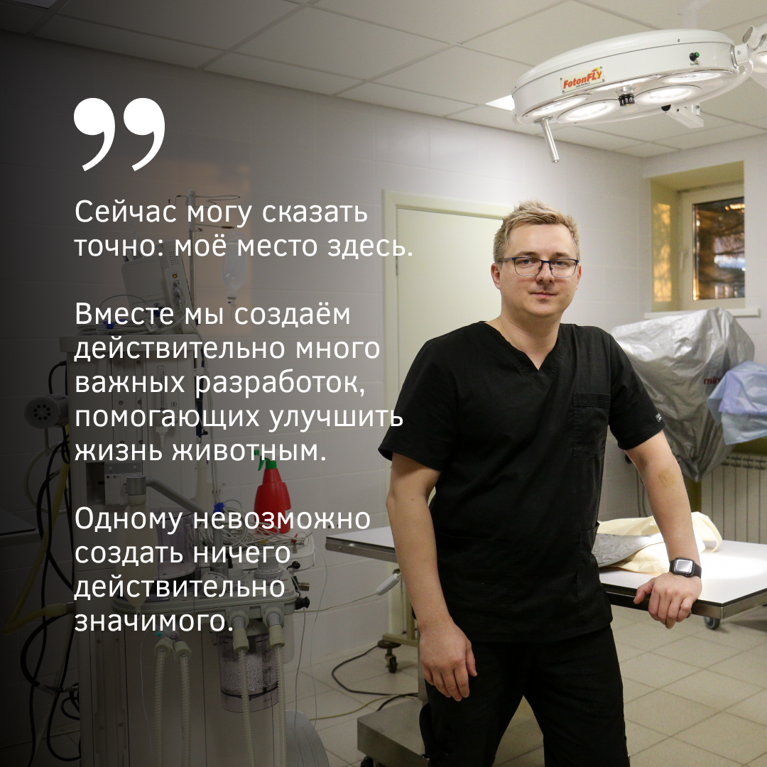 Мы начали вместе с командой клиники «БЭСТ» делать уникальные операции, писать статьи, разрабатывать новые методики лечения, и затем мы получили почётную премию — «Лучшая ветеринарная клиника России 2018 года». Сейчас могу сказать точно: моё место здесь. Вместе мы создаём действительно много важных разработок, помогающих улучшить жизнь животным. Одному невозможно создать ничего действительно значимого.