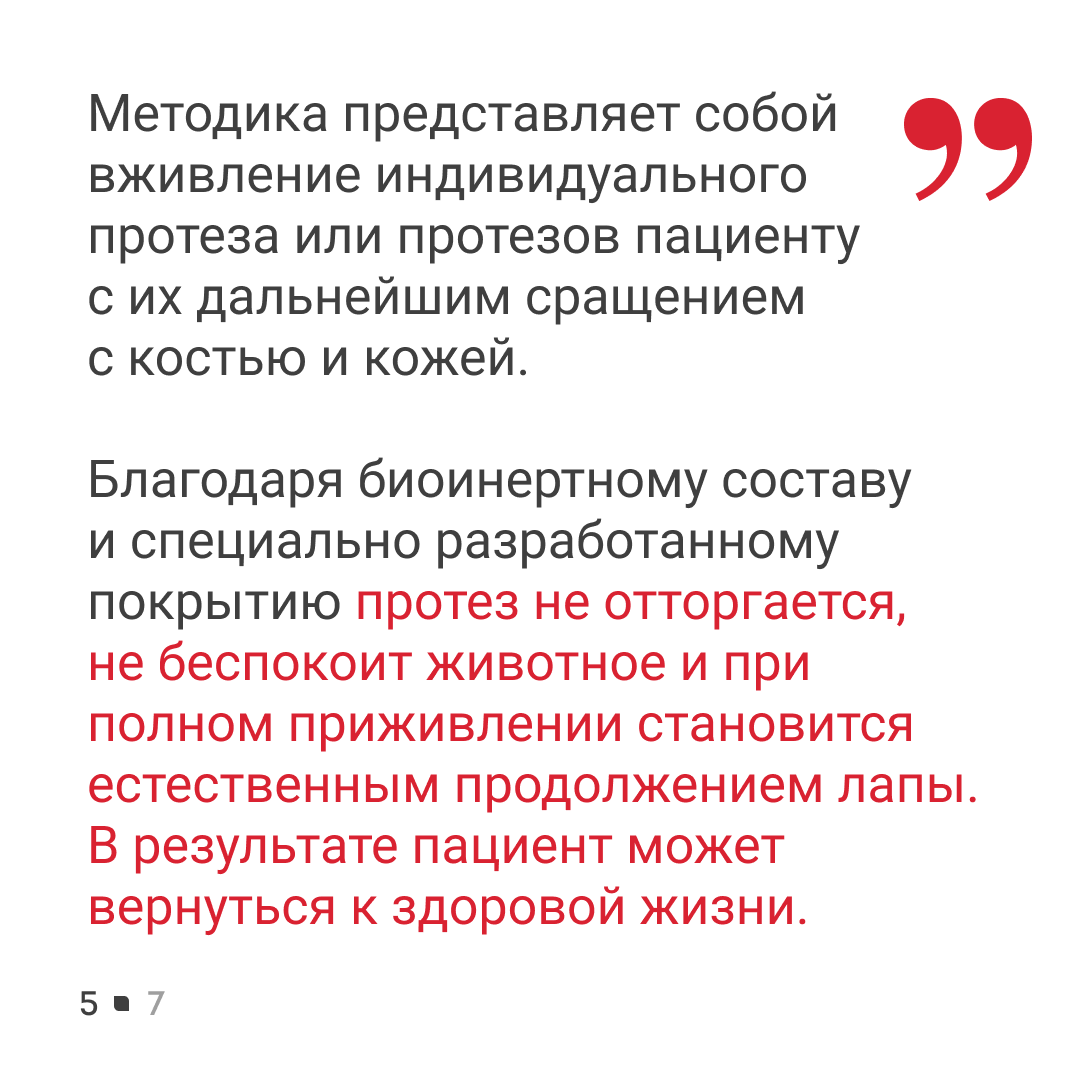 — Технология называется «Чрескожное остеоинтегрируемое протезирование лап у животных после ампутации протезами SerGoFIX». #SHOWMORE__416415#