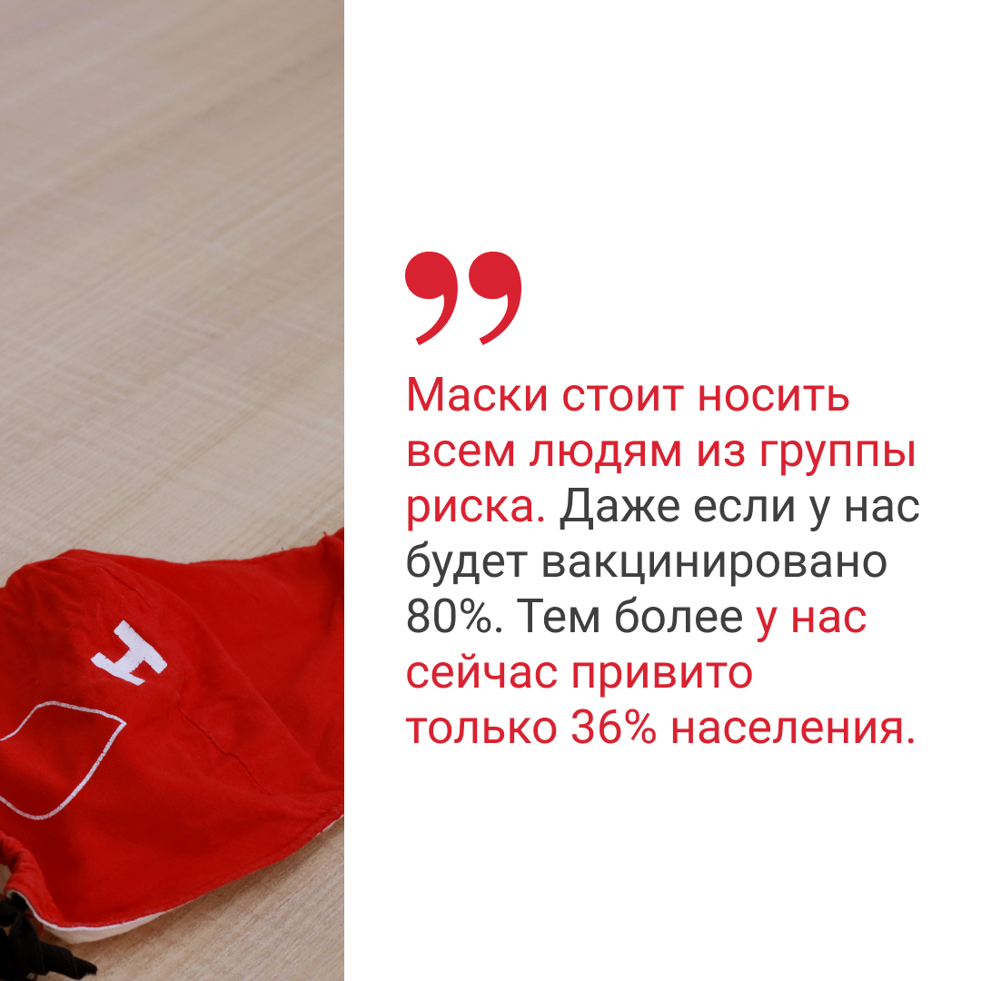 Маски стоит носить всем людям из группы риска. Даже если у нас будет вакцинировано 80%. Тем более у нас сейчас привито только 36% населения.