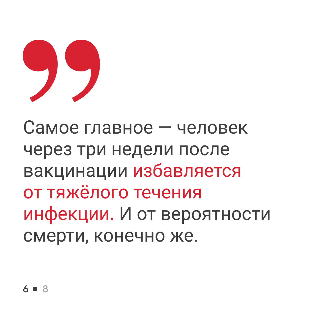 Но защищённость людей от этого возрастает минимум в десять раз. И самое главное — человек через три недели после вакцинации избавляется от тяжёлого течения инфекции. И от вероятности смерти, конечно же.