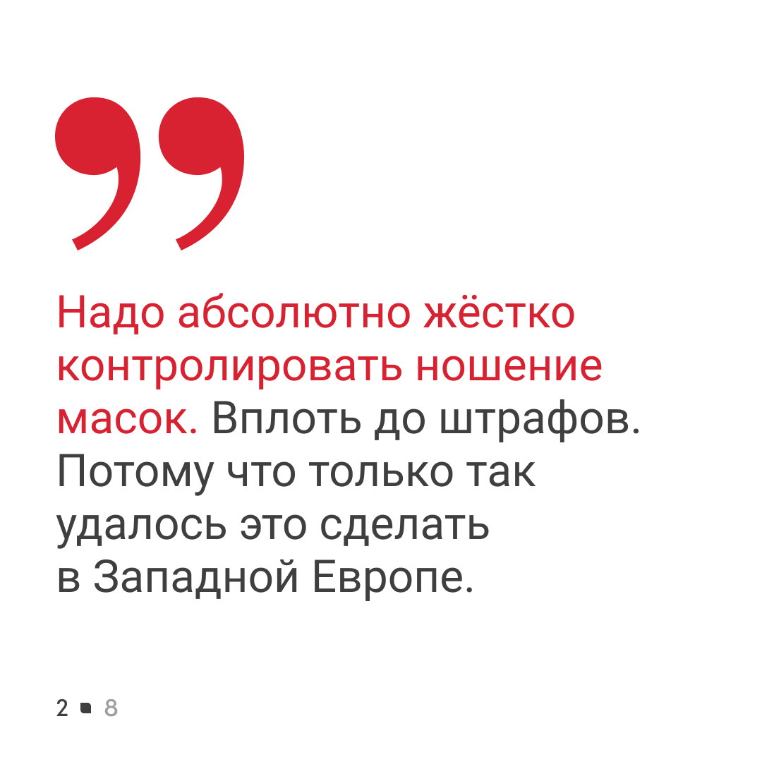 Поэтому я лично считаю, что если уж вводить такие правила, то надо абсолютно жёстко контролировать ношение масок. Вплоть до штрафов. Потому что только так удалось это сделать в Западной Европе.