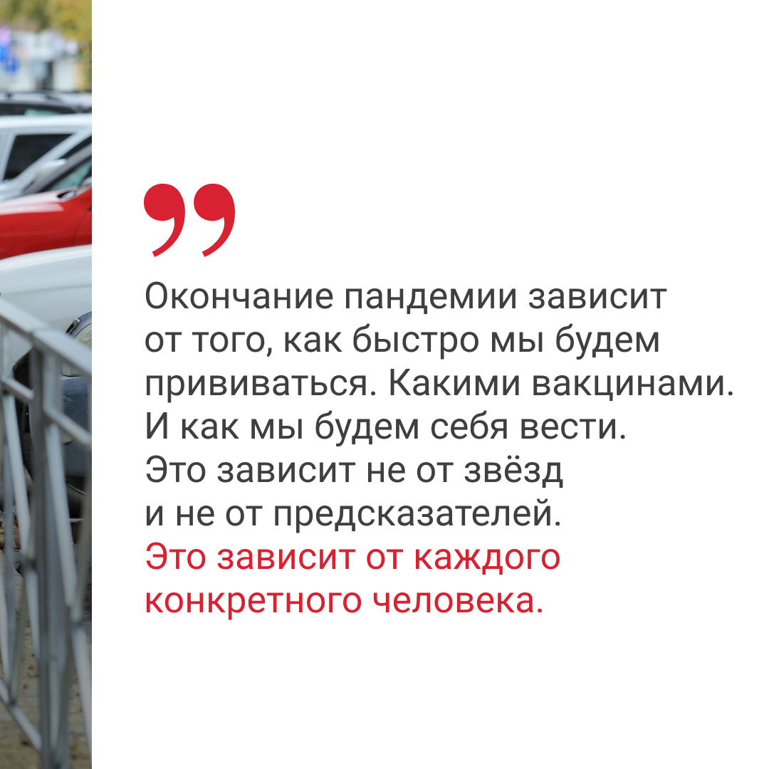 И именно поэтому окончание пандемии зависит от того, как быстро мы будем прививаться. Какими вакцинами. И как мы будем себя вести. Это зависит не от звёзд и не от предсказателей. Это зависит от каждого конкретного человека. Захотел себя защитить — вакцинировался. Захотел защитить себя ещё сильнее — надел правильно маску. Захотел защитить свою семью — уговариваешь всех остальных сделать то же самое.