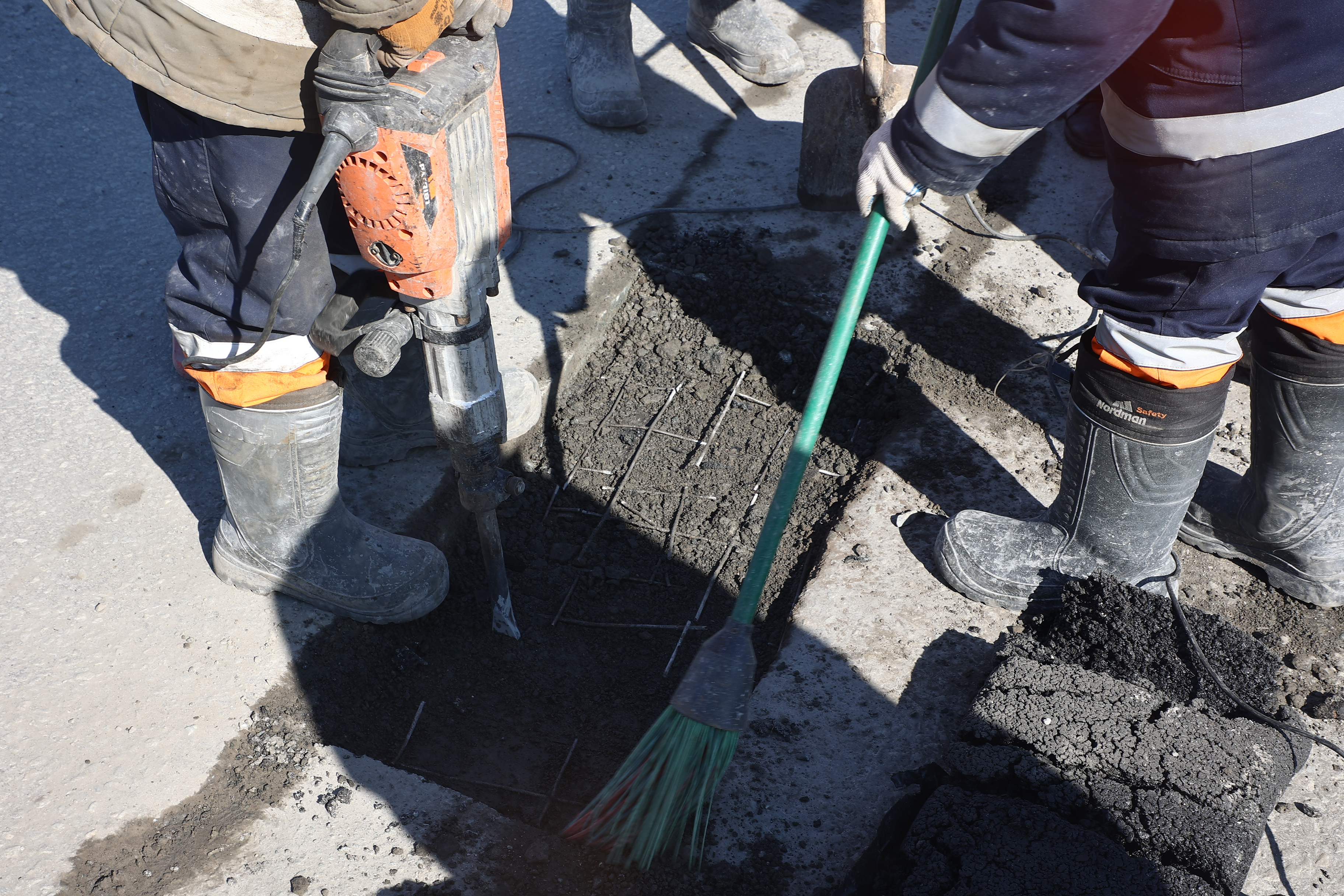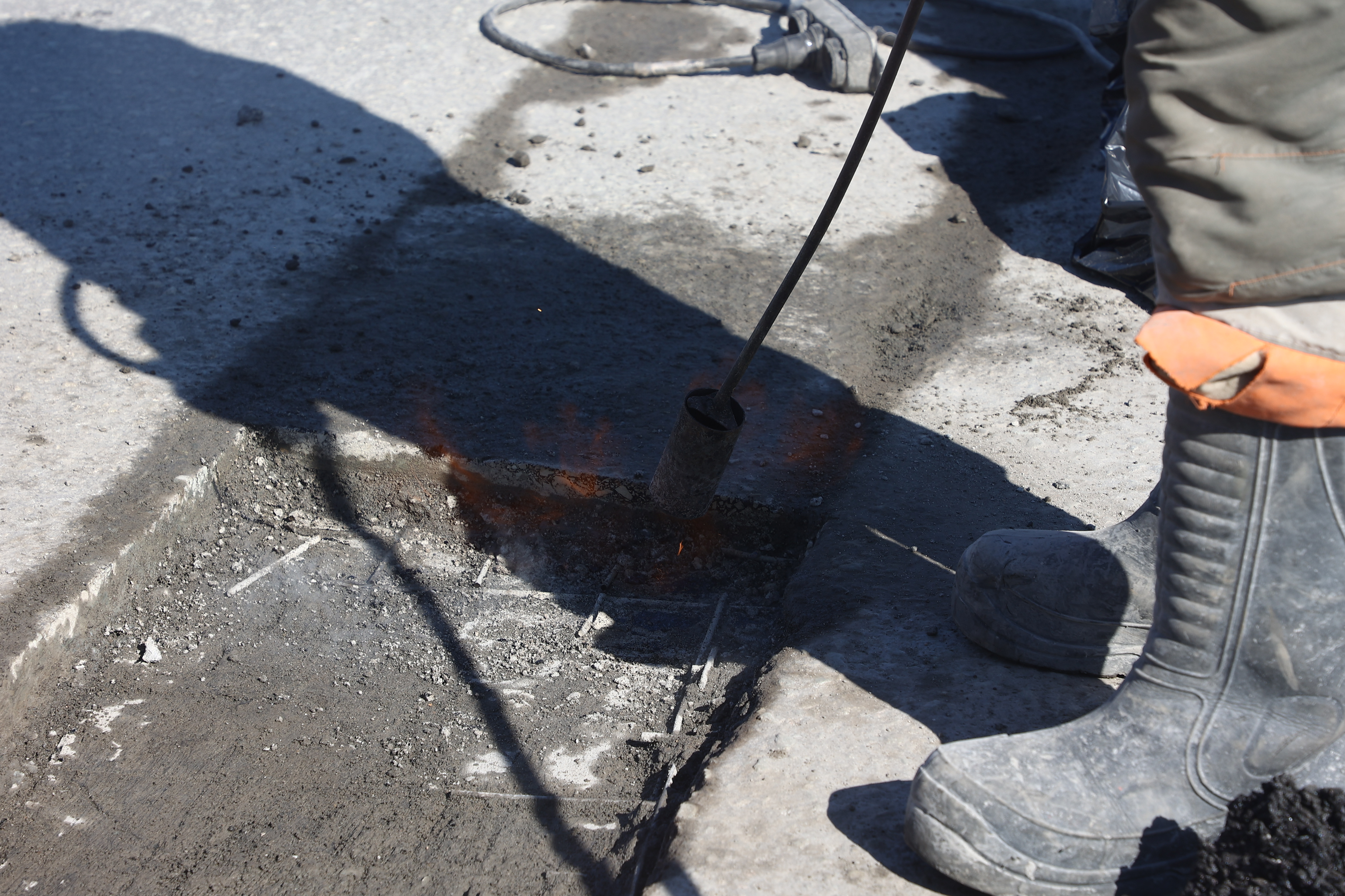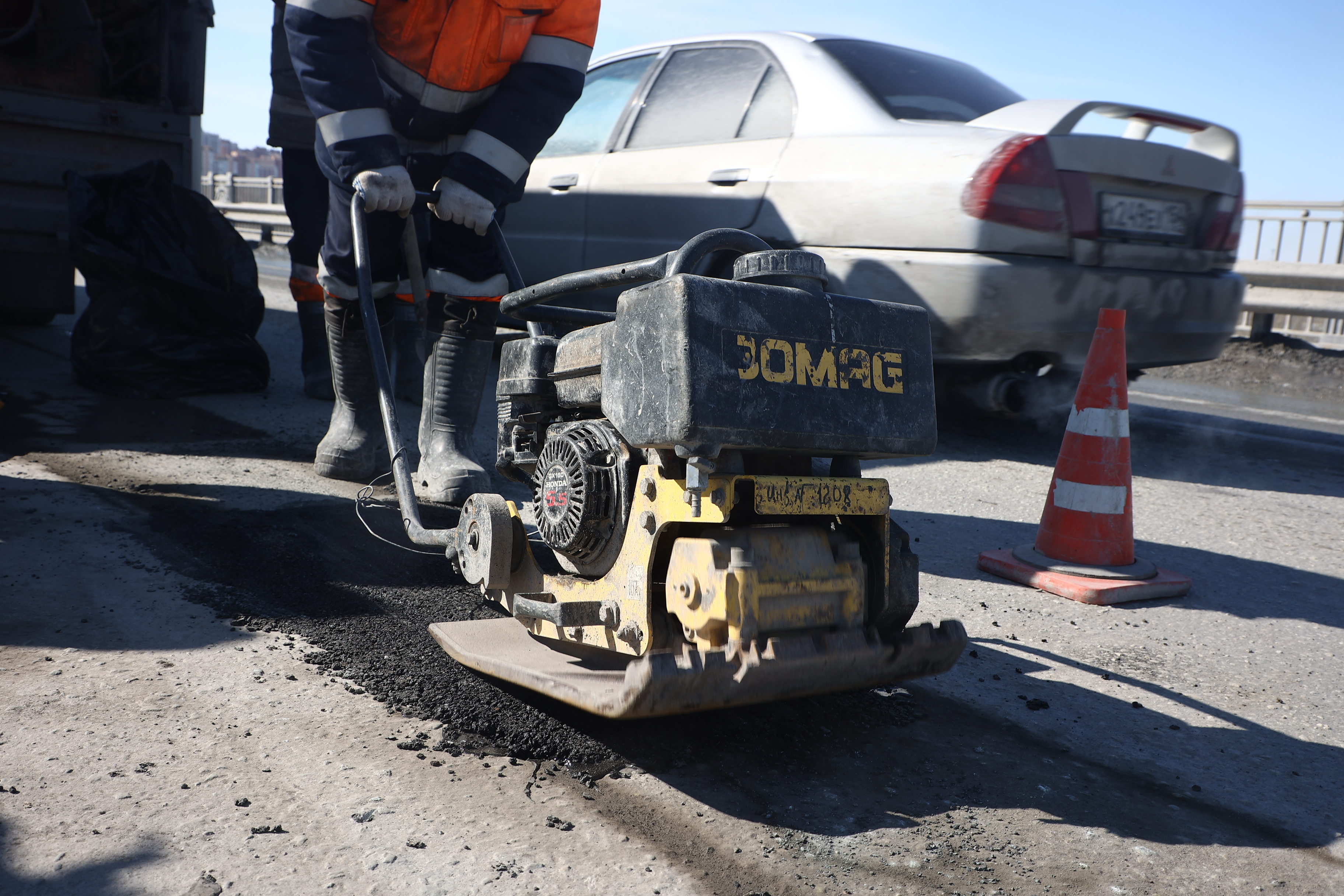 «Выбоина очищается от остатков разрушившегося асфальта. Затем кромку обрезают под прямым углом к покрытию. После этого очищают от мелкой грязи, пыли и мусора, обрабатывают битумной эмульсией. Материал укладывается, распределяется по выбоине и уплотняется виброплитой», — рассказал о технологии заместитель директора по содержанию искусственных сооружений МКУ «Гормост» Дмитрий Шубин.