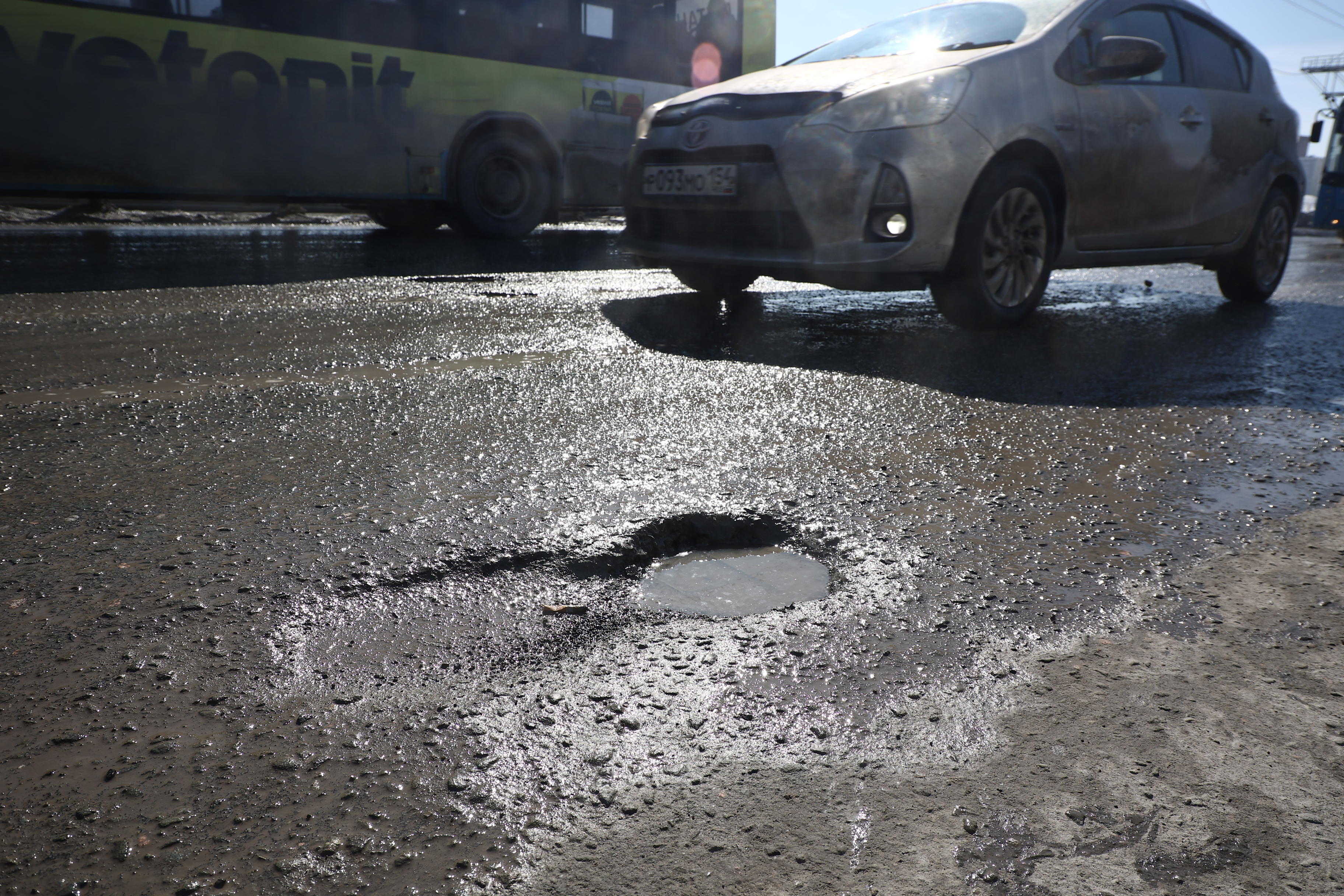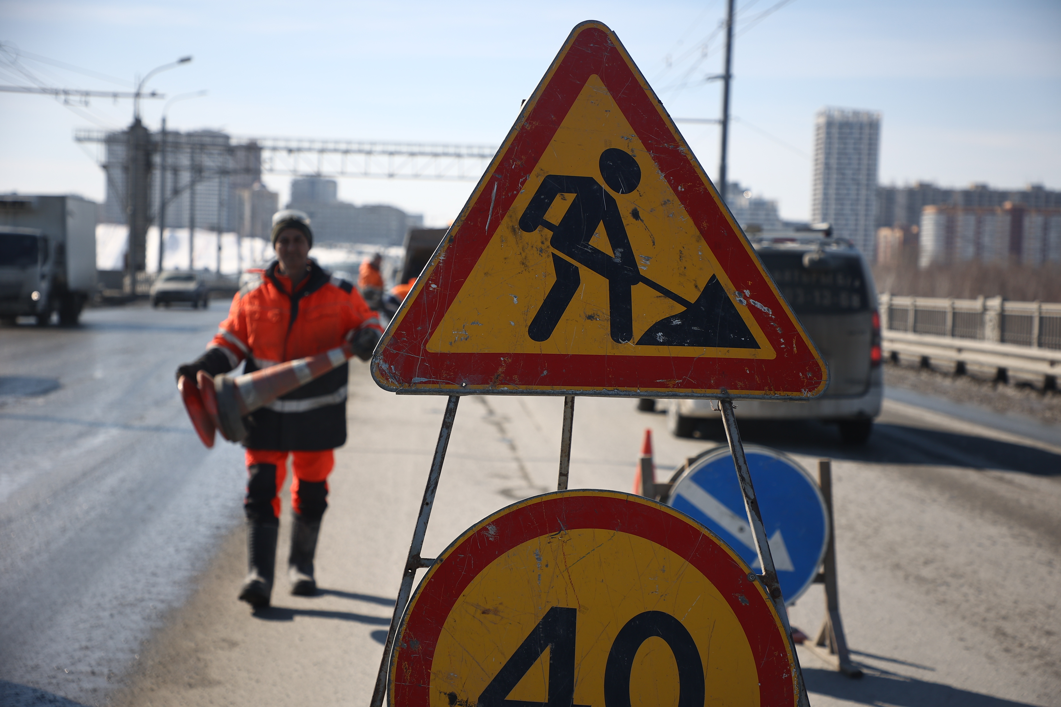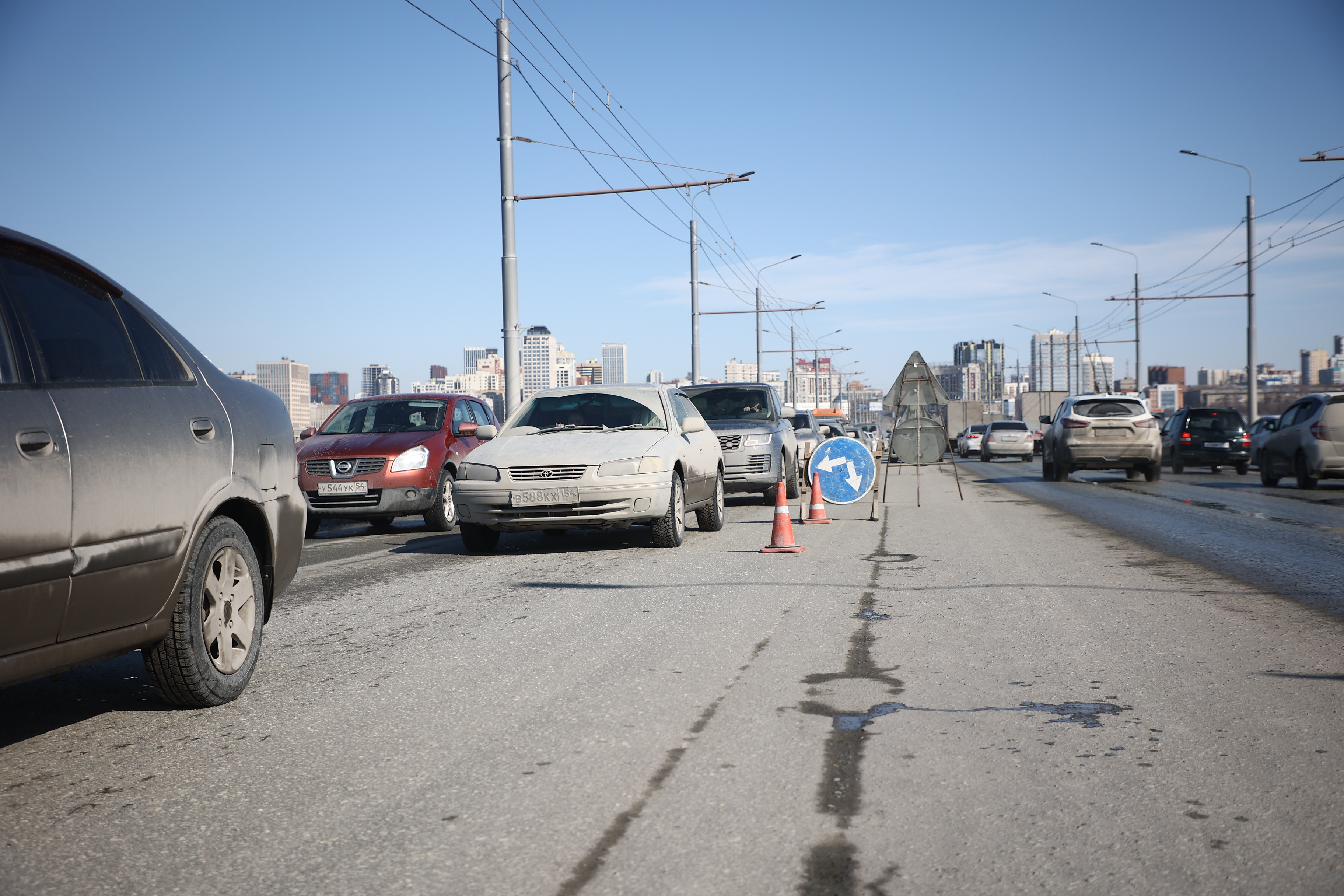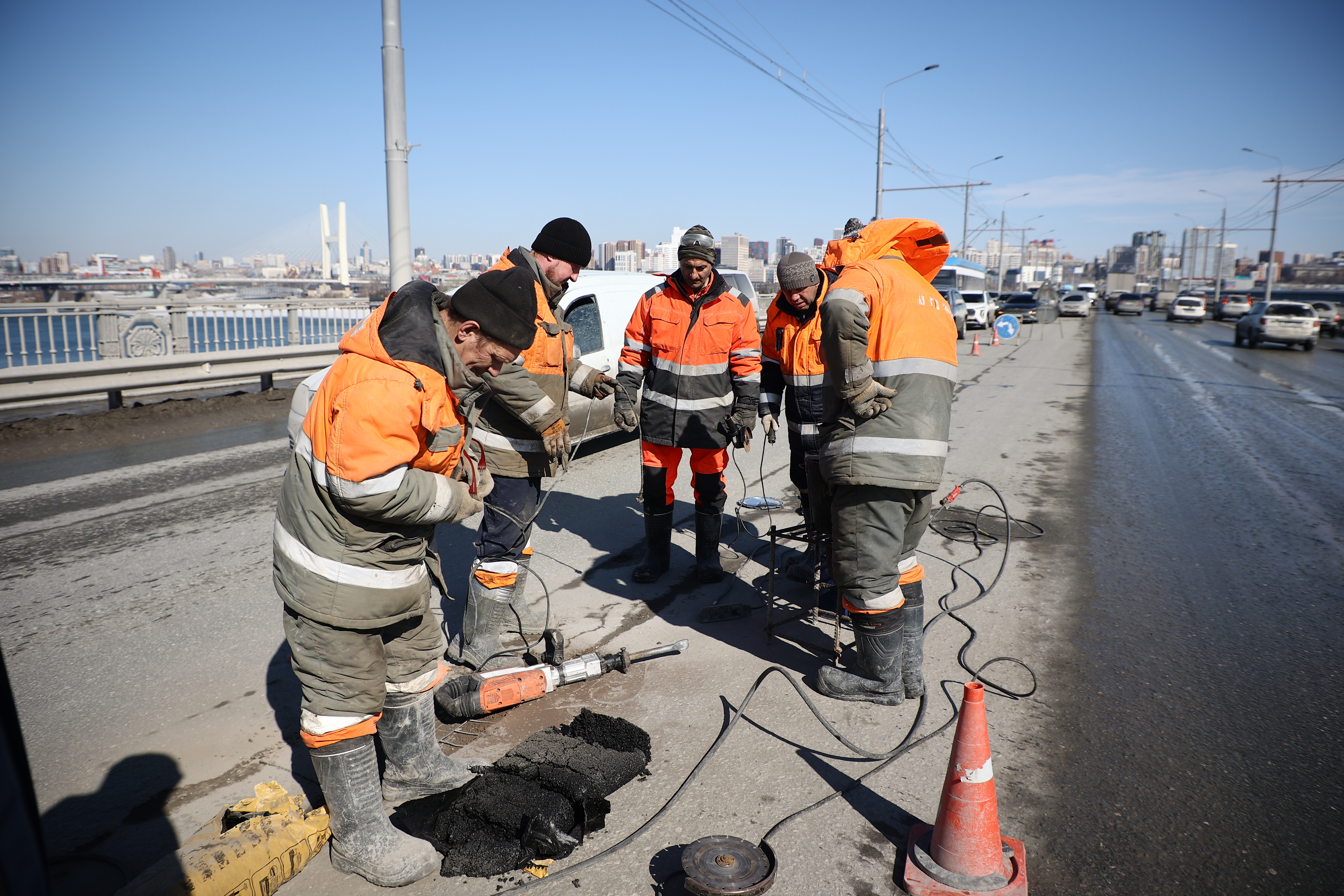Возникшие после зимы выбоины латают на Октябрьском мосту в Новосибирске