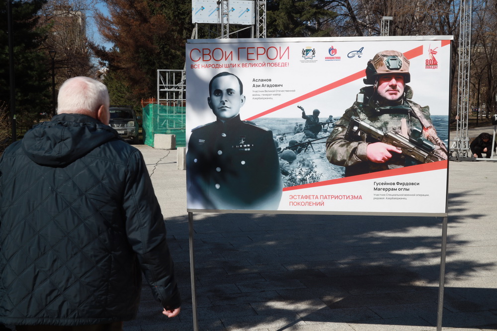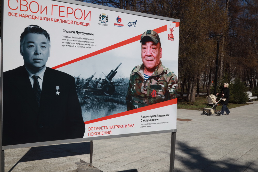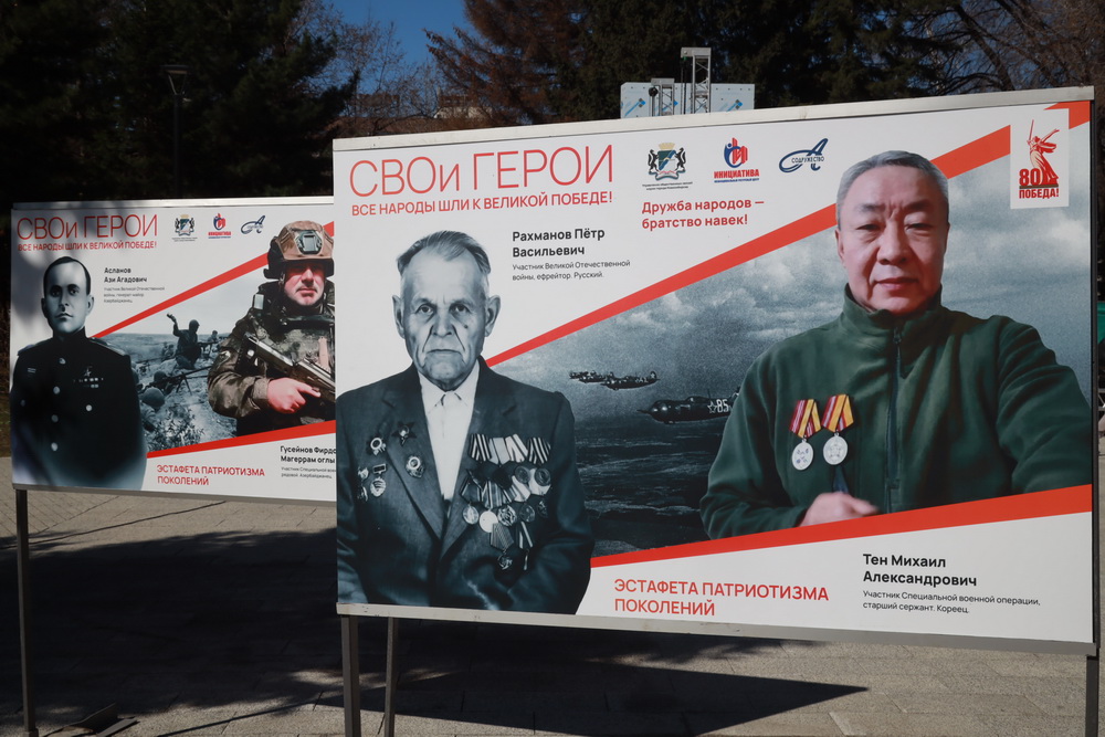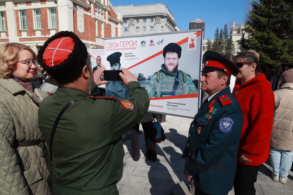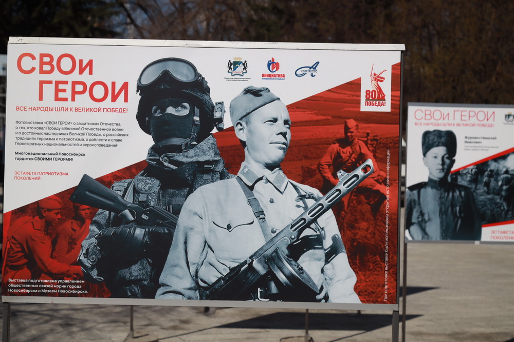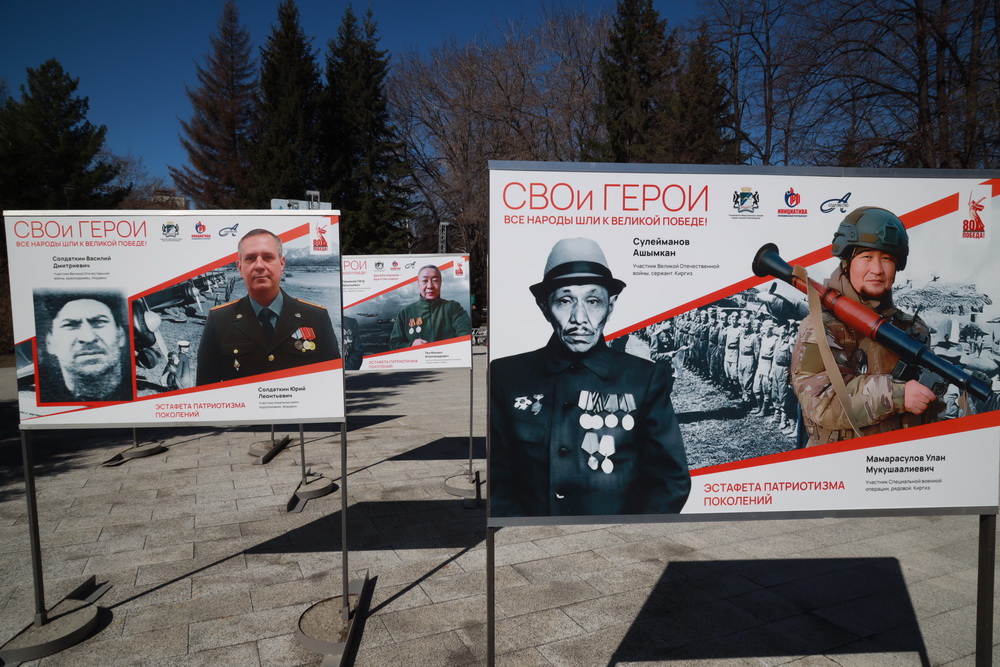 Выставку «СВОи герои» открыли в Первомайском сквере. В центре Новосибирска выставили стенды с портретами бойцов разных национальностей.