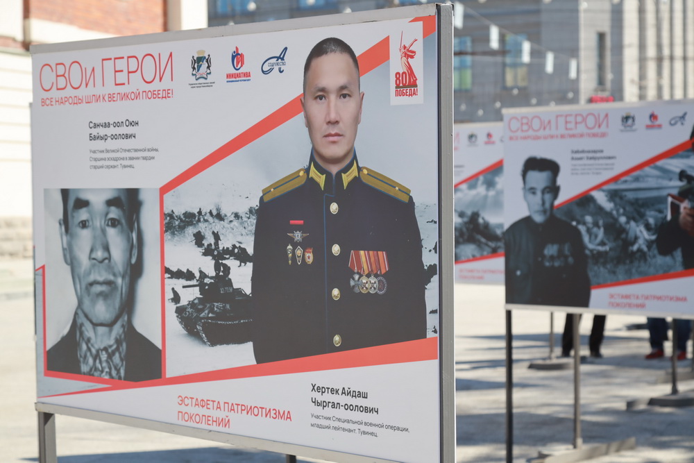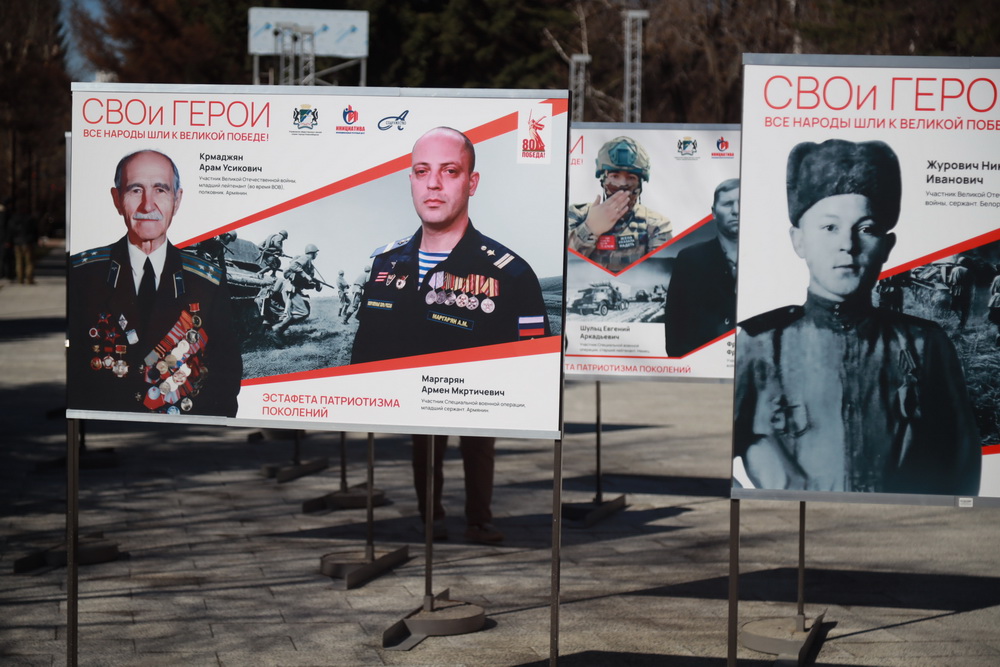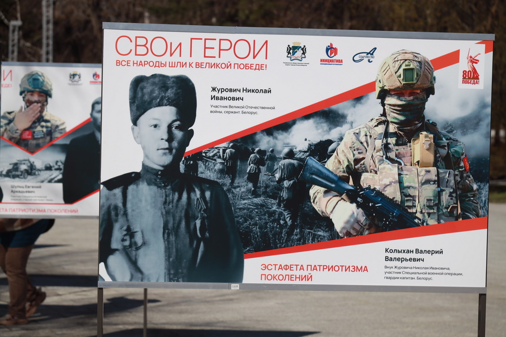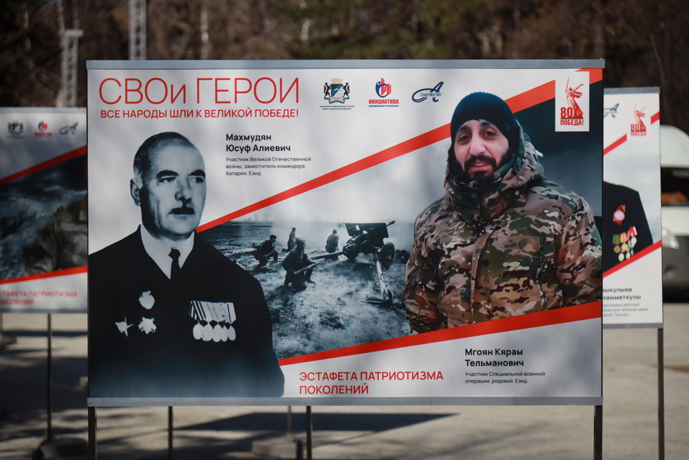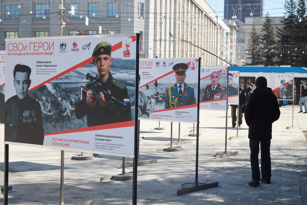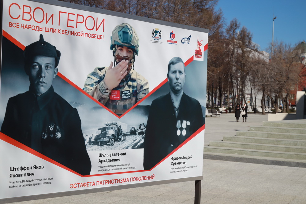 Выставку «СВОи герои» открыли в Первомайском сквере. В центре Новосибирска выставили стенды с портретами бойцов разных национальностей.