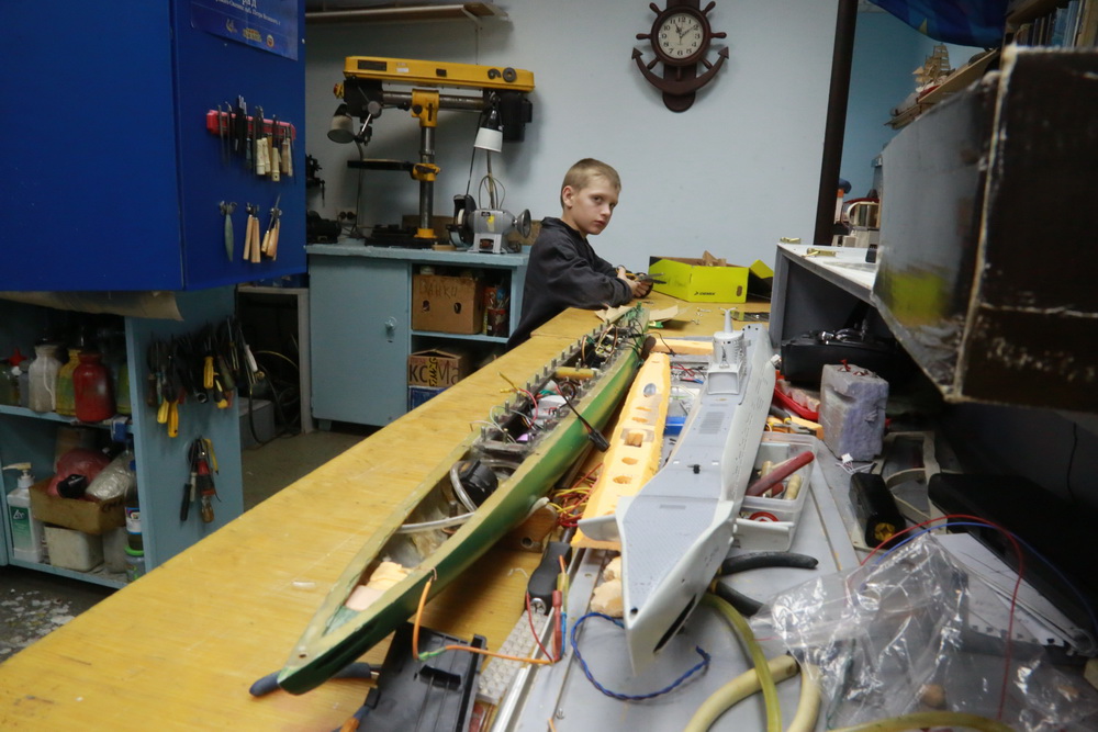 Одну модель корабля можно делать всю жизнь: надстраивать, со временем менять материалы. Процесс становится бесконечным. Студийцы буквально из поколения в поколение передают сборную подводную лодку. Её строят здесь много лет, команда Новосибирска выступает с ней на конкурсах.