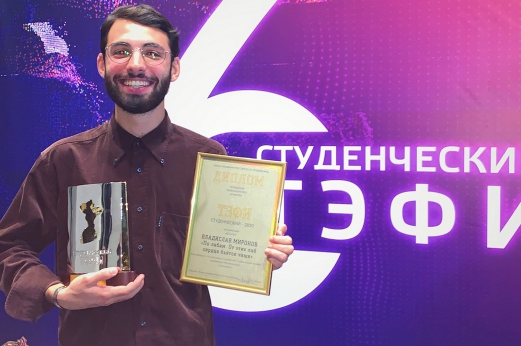 Выпускник журфака НГУ Влад Миронов стал первым в истории новосибирцем, получившим знаменитую награду Академии российского телевидения на главном молодёжном телевизионном конкурсе «Студенческий ТЭФИ». Видеопроект «По лабам. От этих лаб сердце бьётся чаще» победил в номинации «Репортёр».