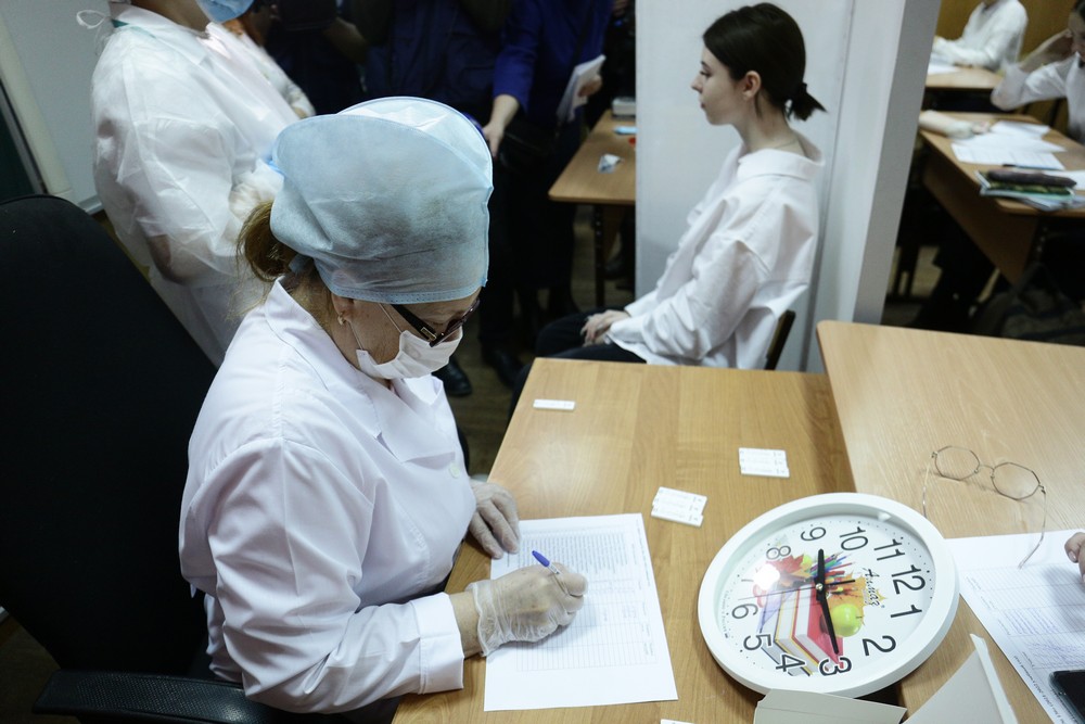 Школьников тестируют на коронавирус прямо на уроке алгебры. По одному приглашают за ширму и берут мазок. Анастасия, как и все её одноклассники, сразу согласилась пройти проверку. Родители решение детей поддержали. Сейчас выпускникам особенно важно не пропускать уроки — идёт последний этап подготовки к ЕГЭ. Потому все заинтересованы выявить заболевание как можно раньше, чтобы вовремя начать лечение и не заразить других учеников.