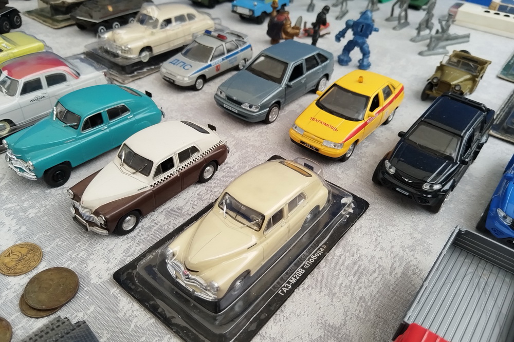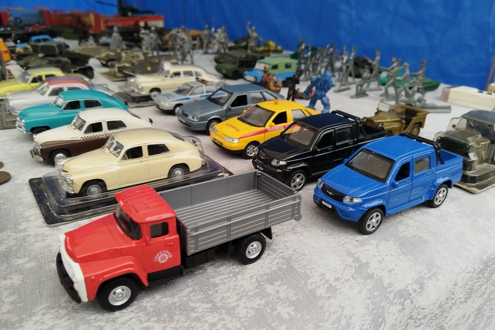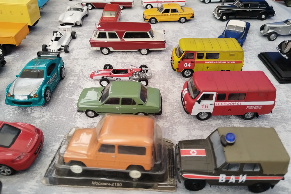 Экспозиция включает не только заводские модели, но и изделия ручной работы. Так, уазик-«буханка», выполненный из картона и смолы с мельчайшей детализацией, обойдётся в 800 рублей.