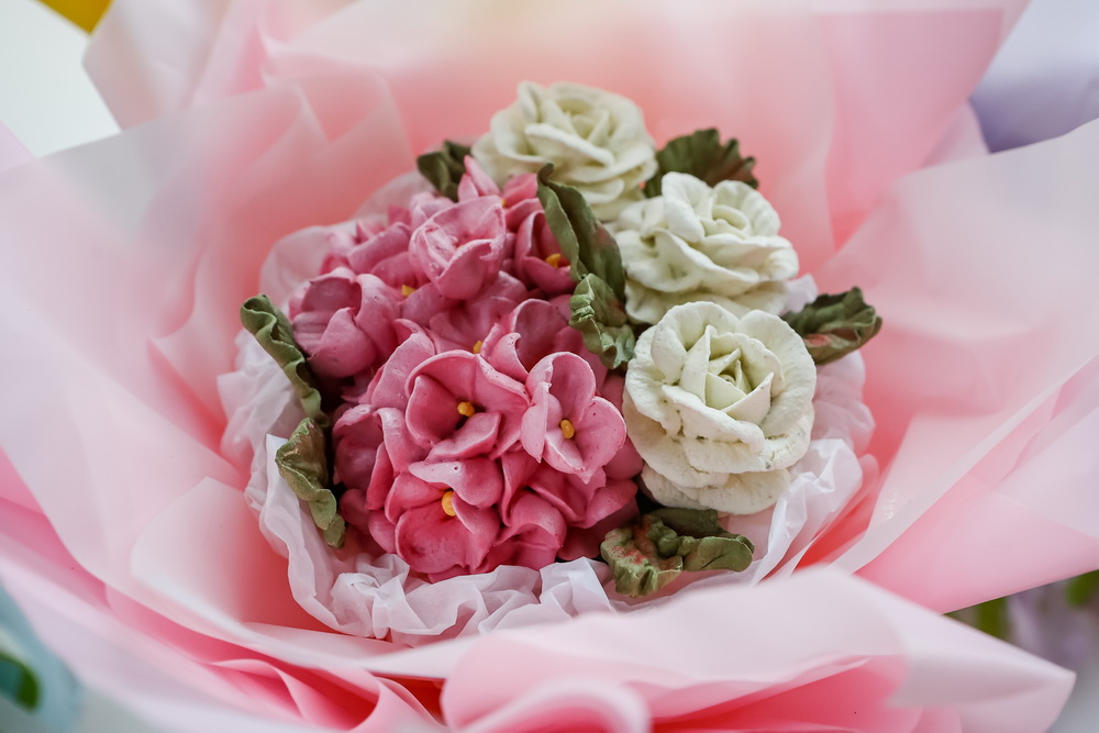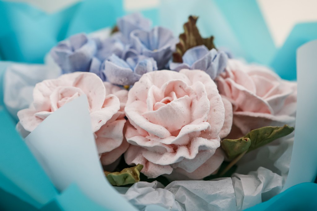 Когда цветы стабилизировались, из них собирают букет. Для этого с помощью флористической бумаги, шпажек и подложки готовят основание, куда с помощью зубочисток крепят готовые бутоны. Для ещё большей реалистичности композицию украшают листками и ягодами из зефирной массы.