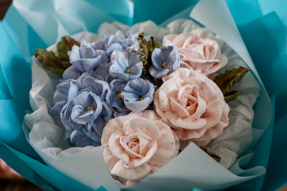 При изготовлении цветочных букетов применяют пищевые красители. Они дают любой требуемый оттенок. Расходные материалы для кондитерского цеха, а также упаковку и всевозможный декор продают в специализированных магазинах или на интернет-площадках.