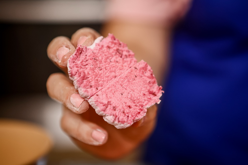 В качестве красителей для классического зефира мастер использует ягоды — чернику, смородину, клубнику, клюкву. Натуральность продукта выдают их крупинки, попадающиеся в основе.