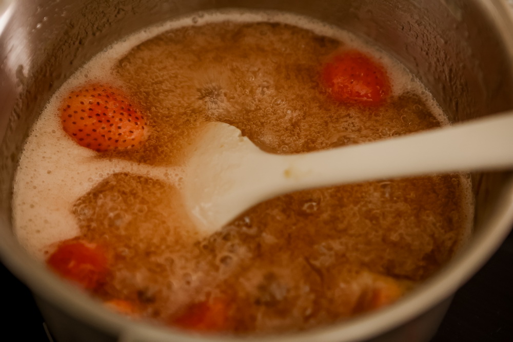 Сироп нужно уваривать минут 20, пока не исчезнет пена. Как только она уйдёт, а масса станет густой — значит готово. Кондитер подчёркивает, что нельзя недоварить или переварить сироп, поскольку в итоге зефирная основа не получится — будет либо рыхлой, либо тягучей. Для работы следует брать посуду с толстым дном, иначе агар-агар пригорит. Это обязательное условие. Кроме того, состав необходимо постоянно помешивать. Ягоды важно размять, чтобы они отдали лишнюю влагу.