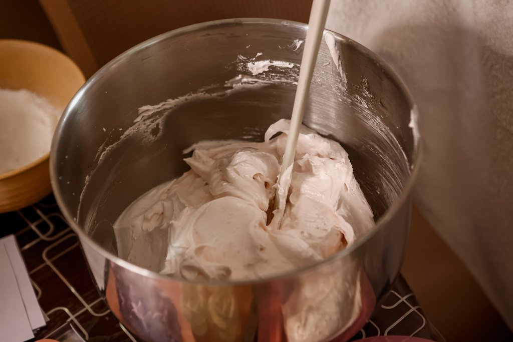 Меренгу делают в планетарном миксере или с помощью ручного миксера с венчиками. Когда взбили её до устойчивых пиков, уваренный до нужной консистенции сироп горячим вливают в чашу миксера и продолжают взбивать, пока в смеси не появятся характерные «пещерки».