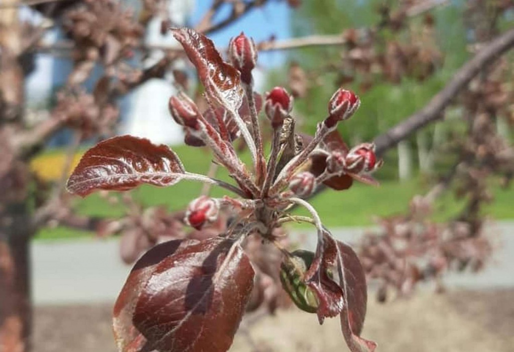 На временно закрытой для посещений Михайловской набережной в Новосибирске зацвели краснолистные яблони «Рудольф» и голландские тюльпаны, луковицы которых высадили на клумбы прошлой осенью.
