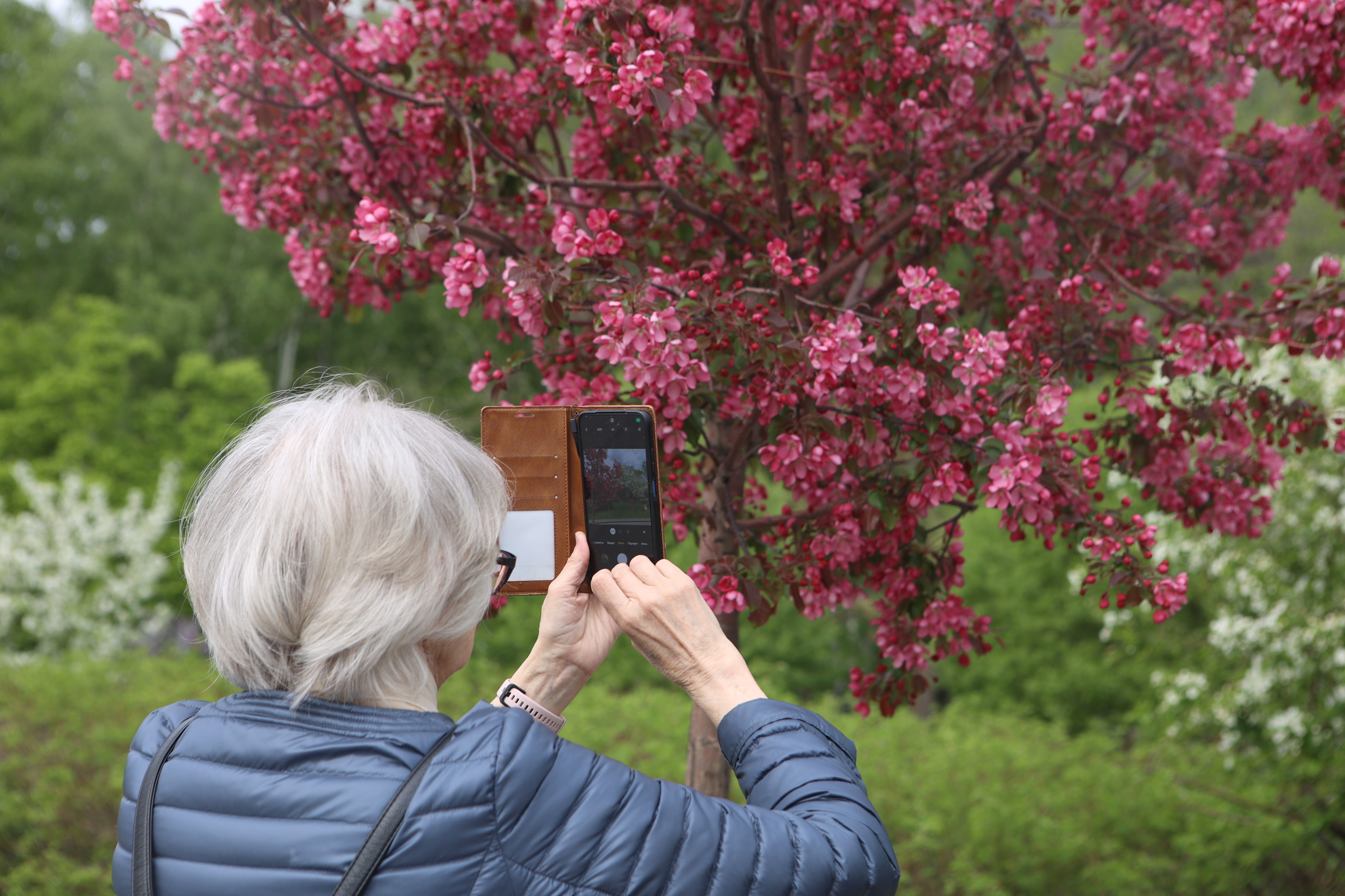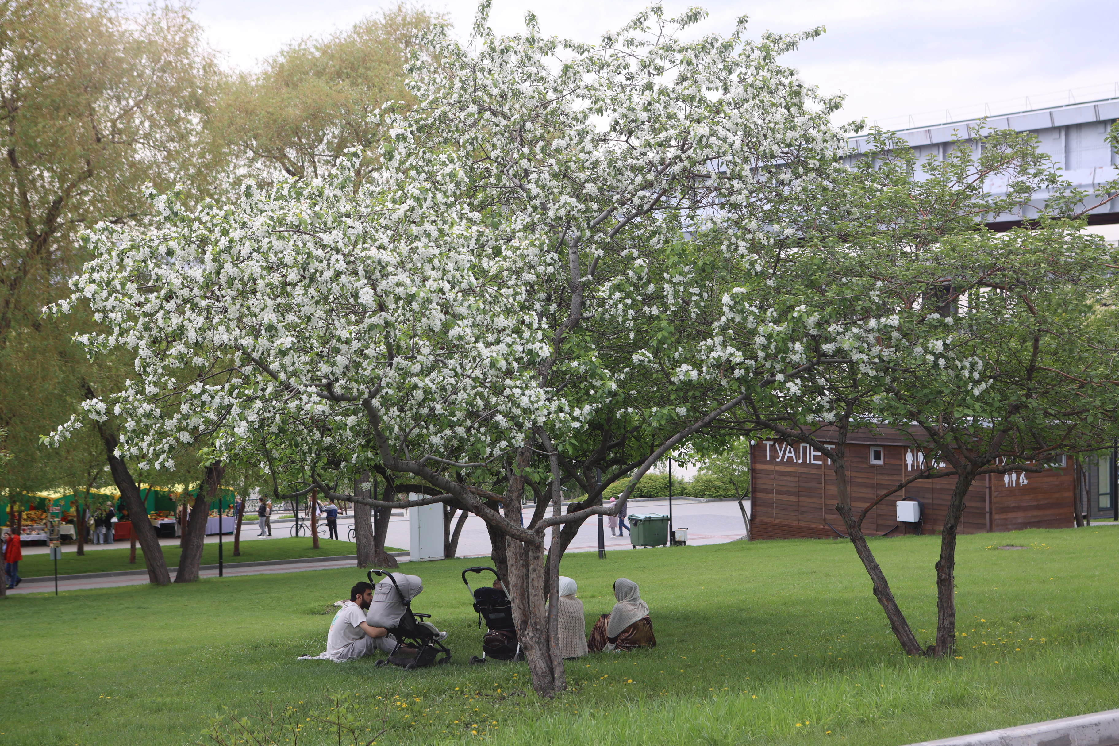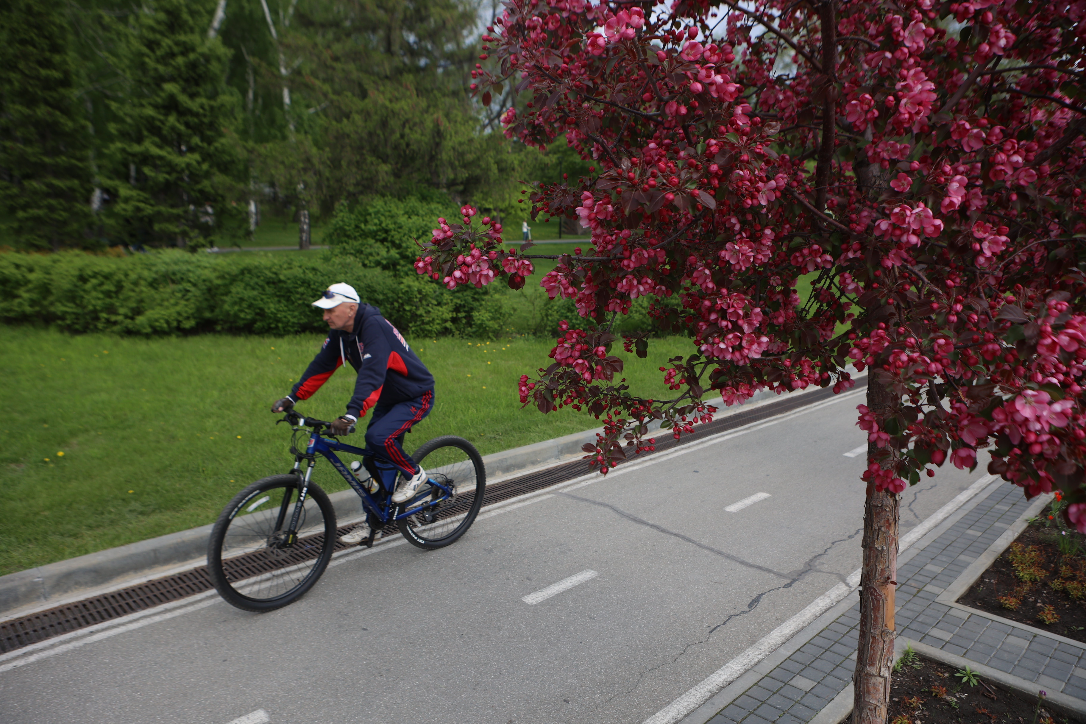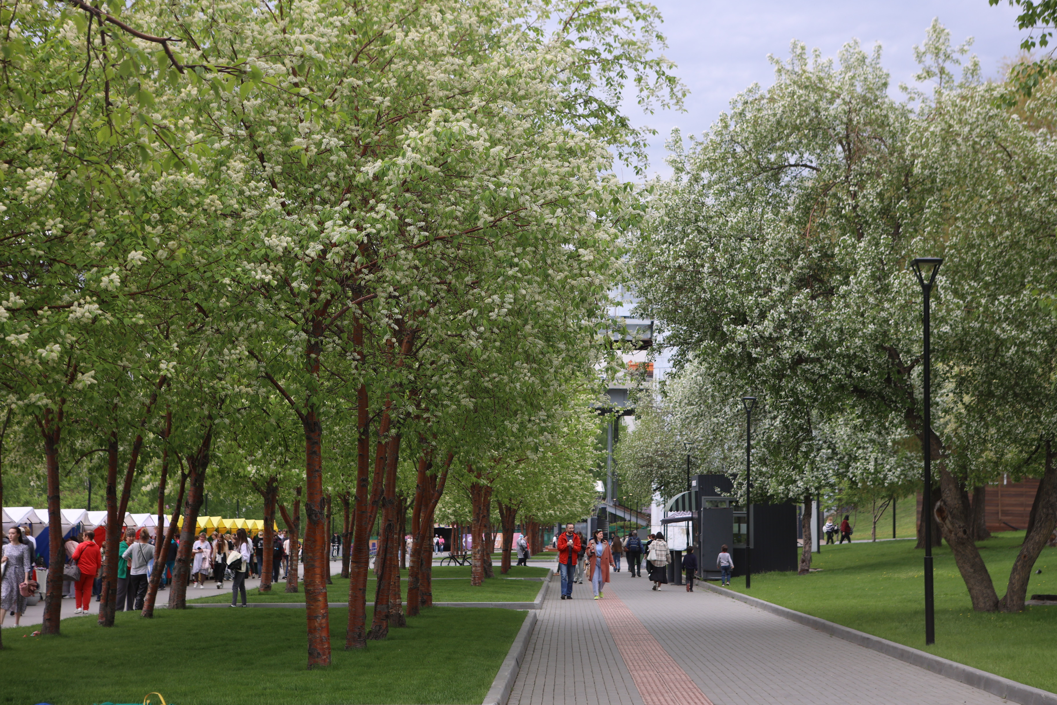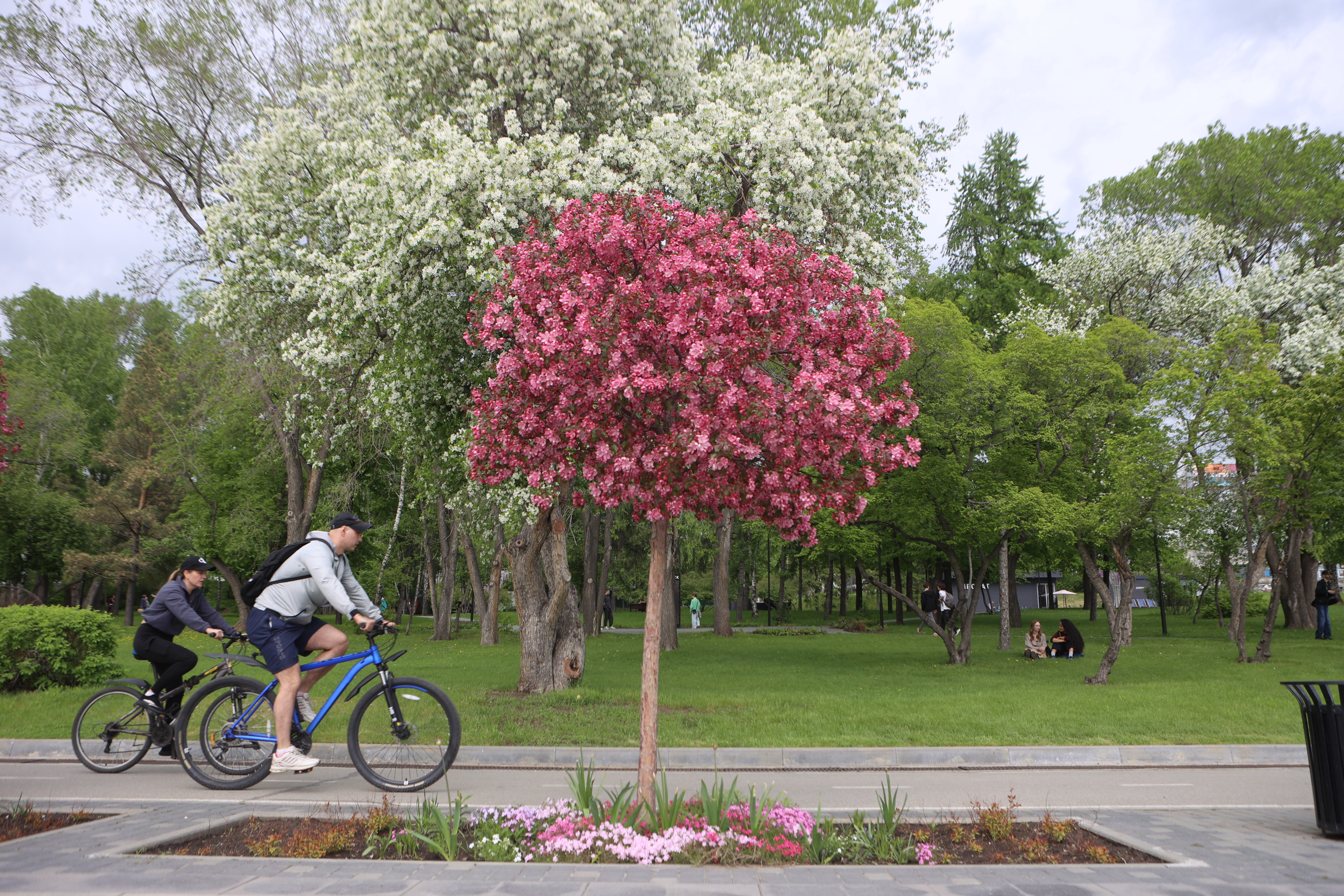 Новосибирцы приходят в парк на набережной, чтобы отдохнуть и сделать эффектные фотографии. Кроме розовых яблонь, буйным цветом радуют белые, а также черёмухи Маака.