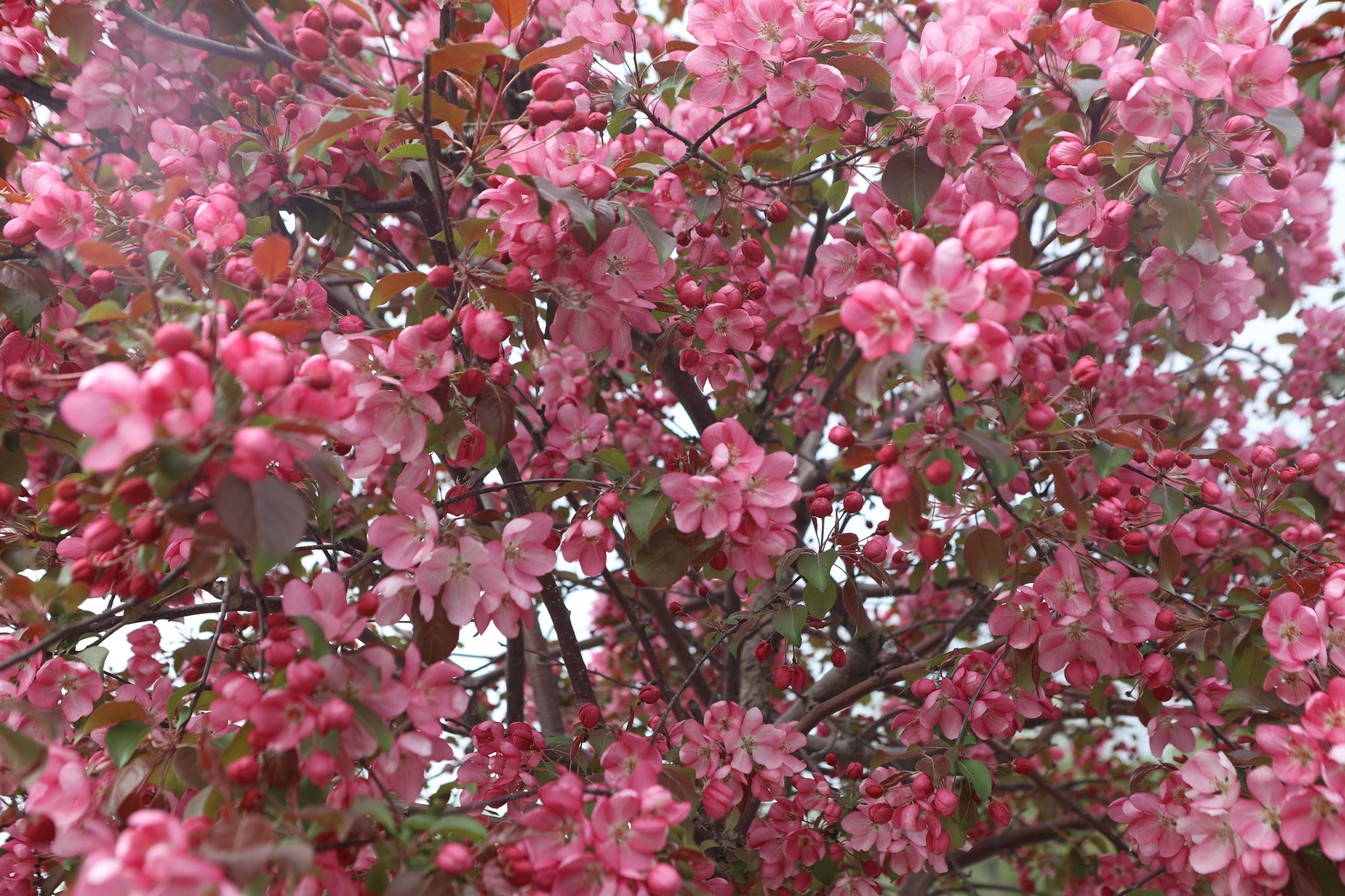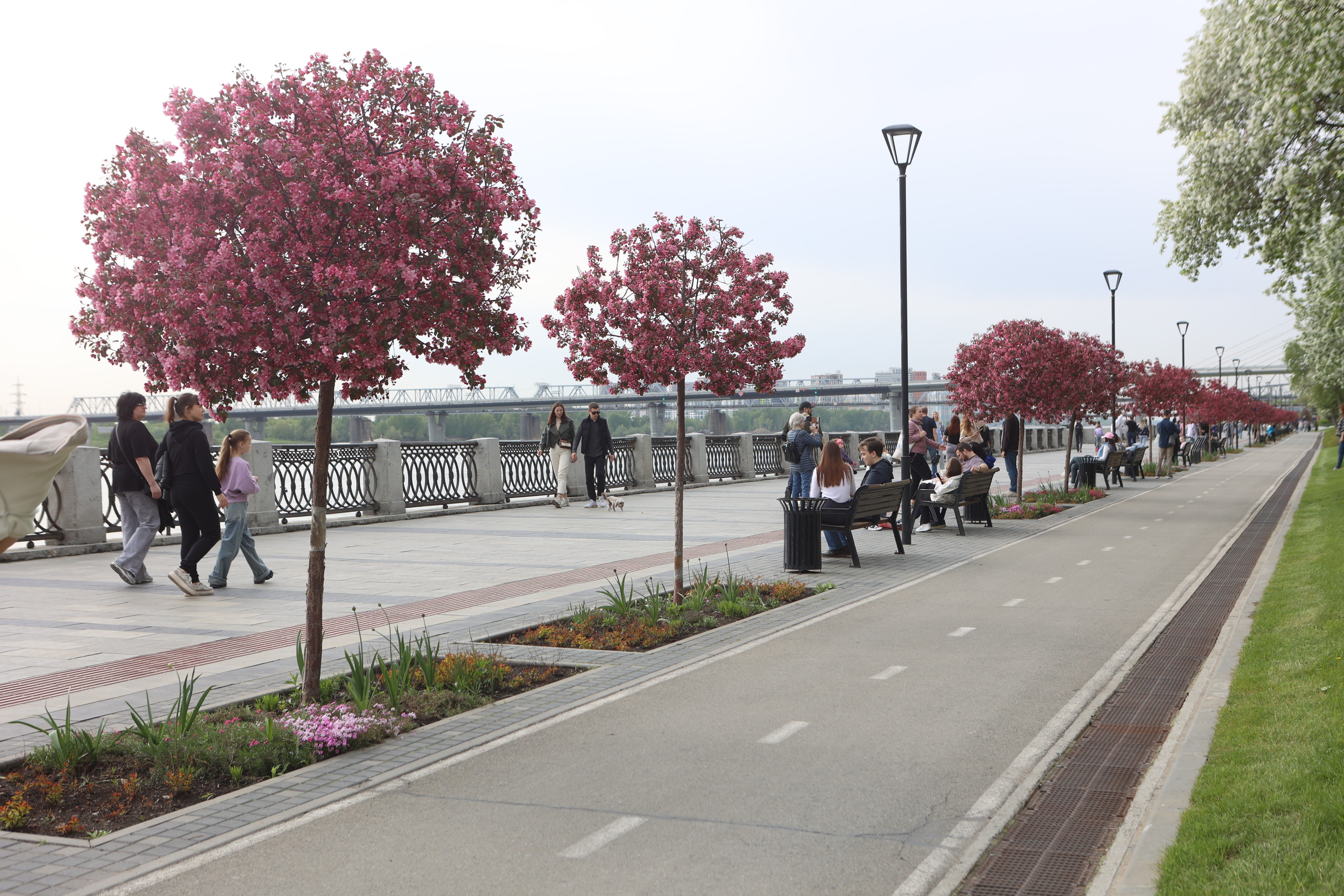 Яркими красками цветения привлекает новосибирцев Михайловская набережная. Сотни горожан едут полюбоваться удивительными краснолистными яблонями, набравшими цвет.