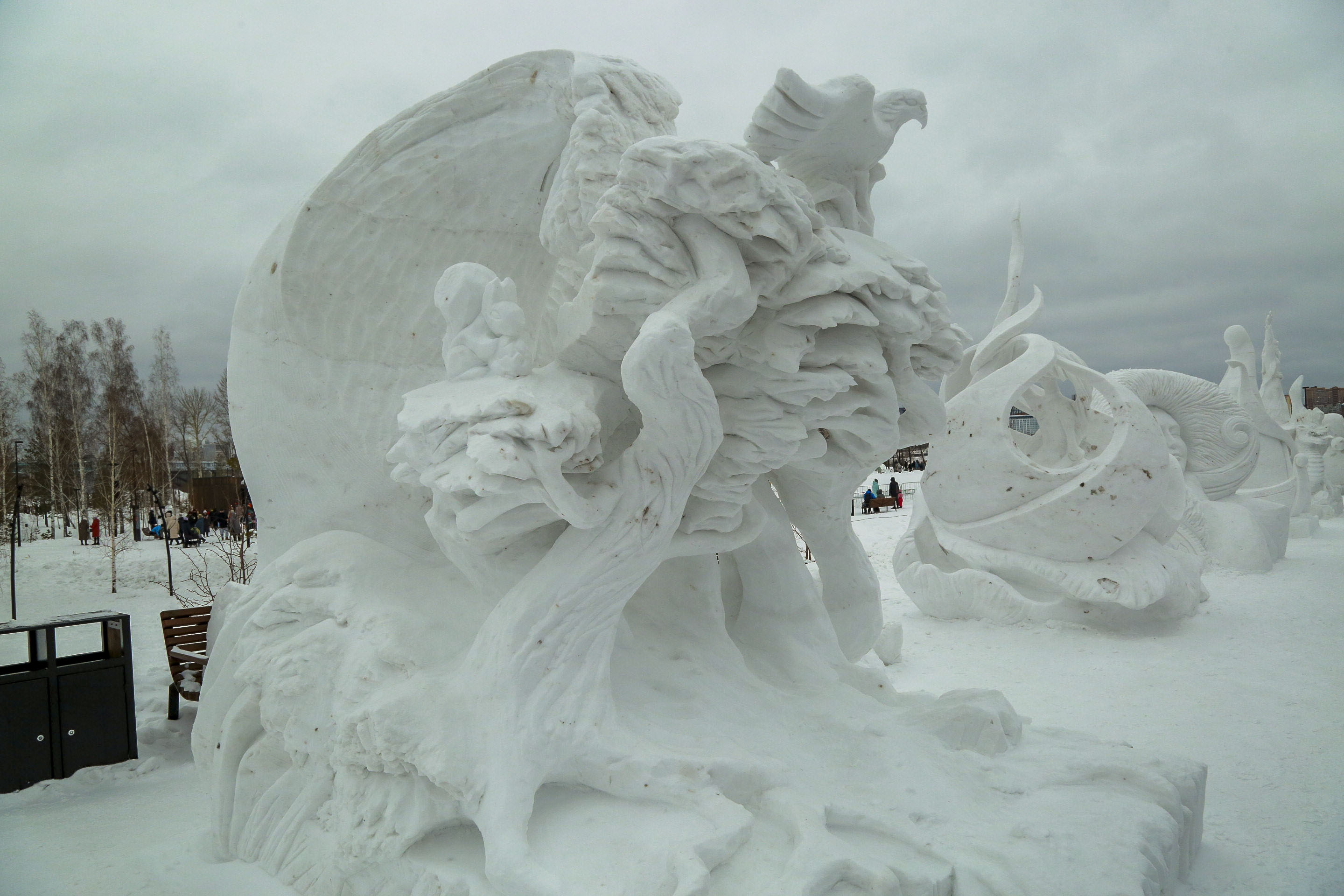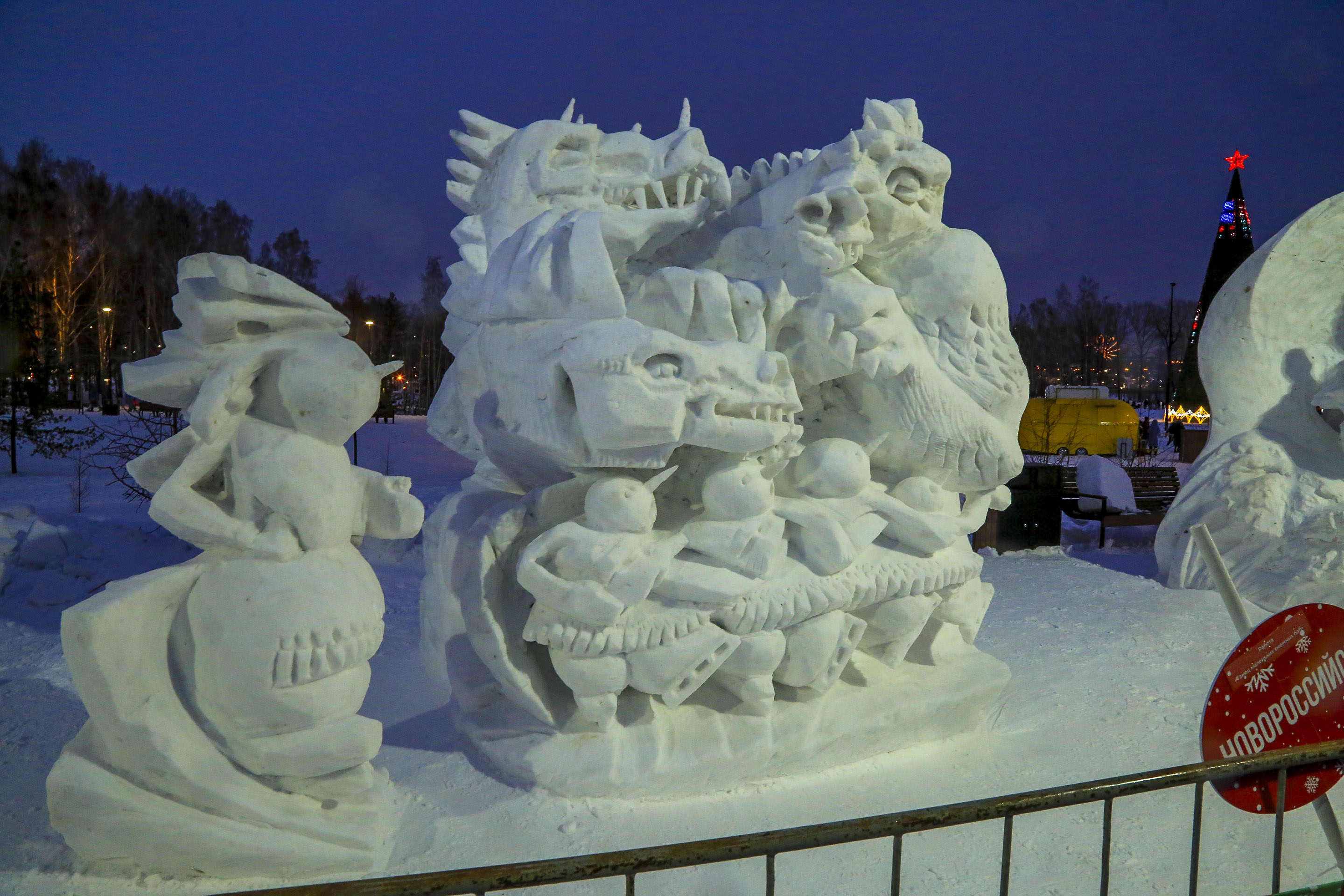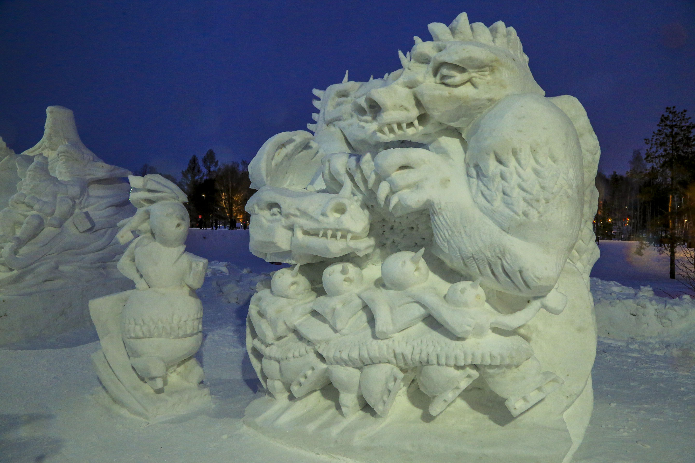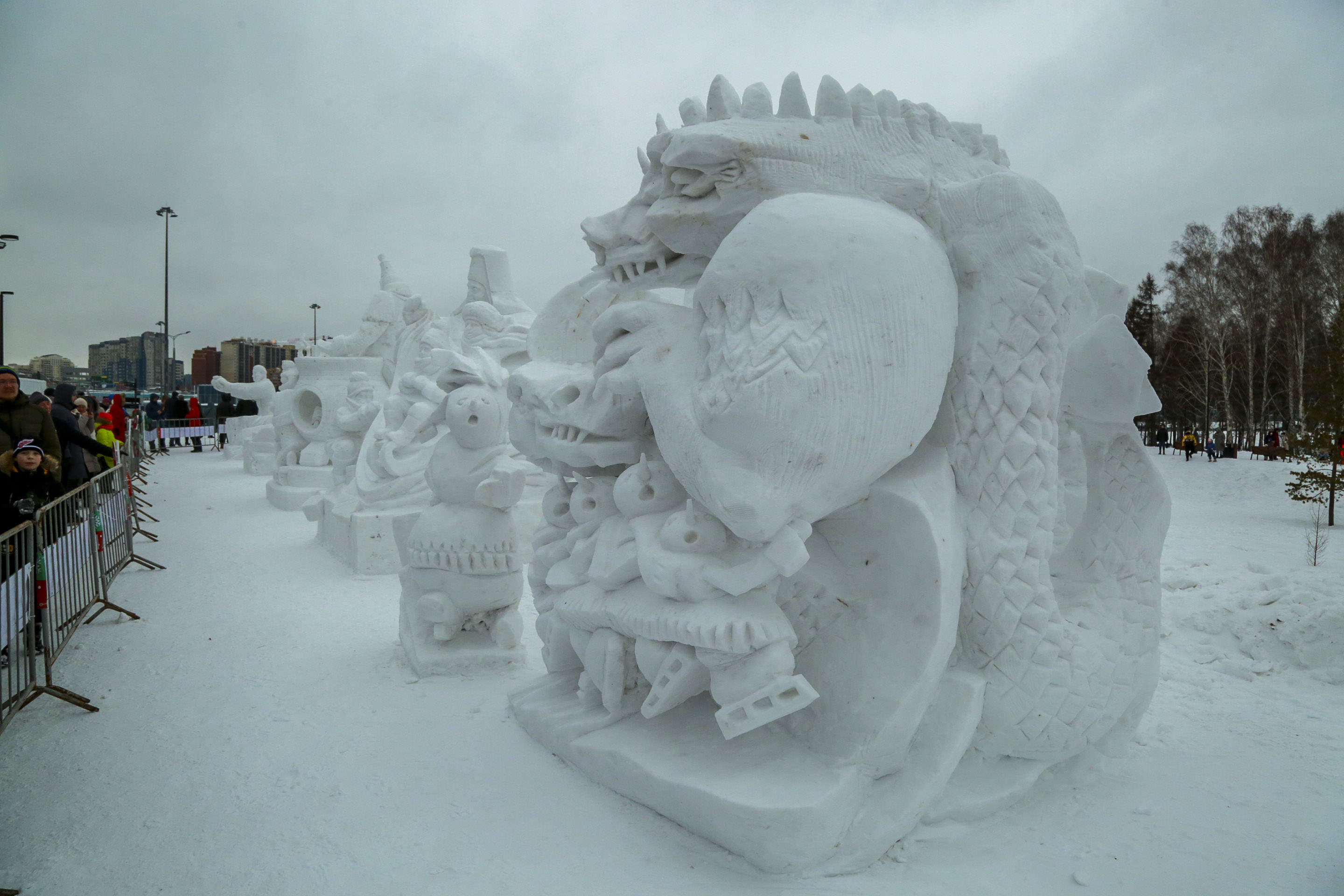 Неваляшка, снеговик, трёхглавый дракон: парк «Арена» на целый месяц превратился в сказку. Мастера из разных уголков России с помощью инструментов и фантазии за считанные дни создали скульптуры из снега к традиционному конкурсу на приз мэра Новосибирска.