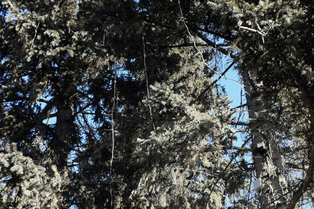 Если сейчас посмотреть на ели, то можно заметить, что их цвет совершенно неестественный. Серый налёт покрывает все иголки и ветки, особенно интенсивно в нижней части кроны.