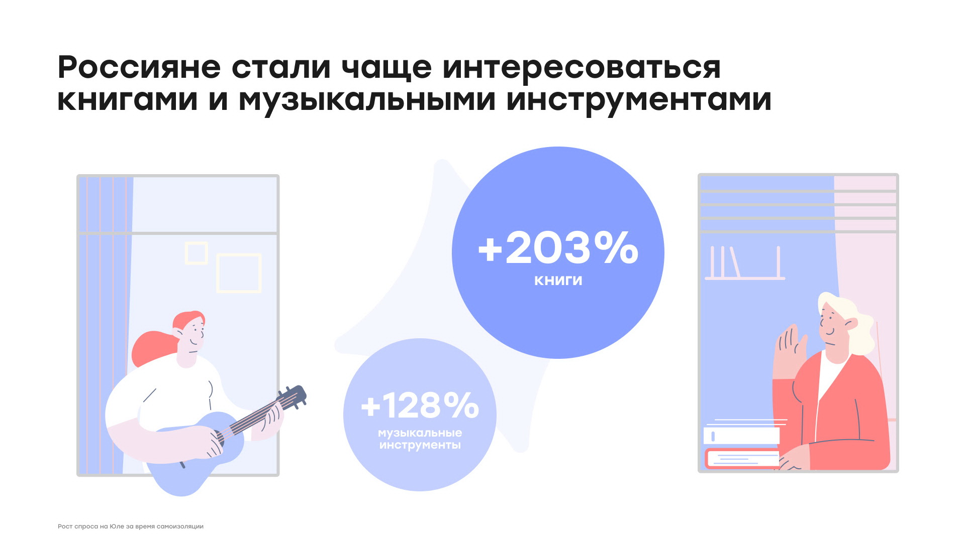 Что касается досуга, тот тут оказался высоким спрос на музыкальные инструменты: скрипки (+43%) и гитары (+22%). Популярность книг выросла на 203%. Особенно часто искали произведения Роберта Стивенсона.