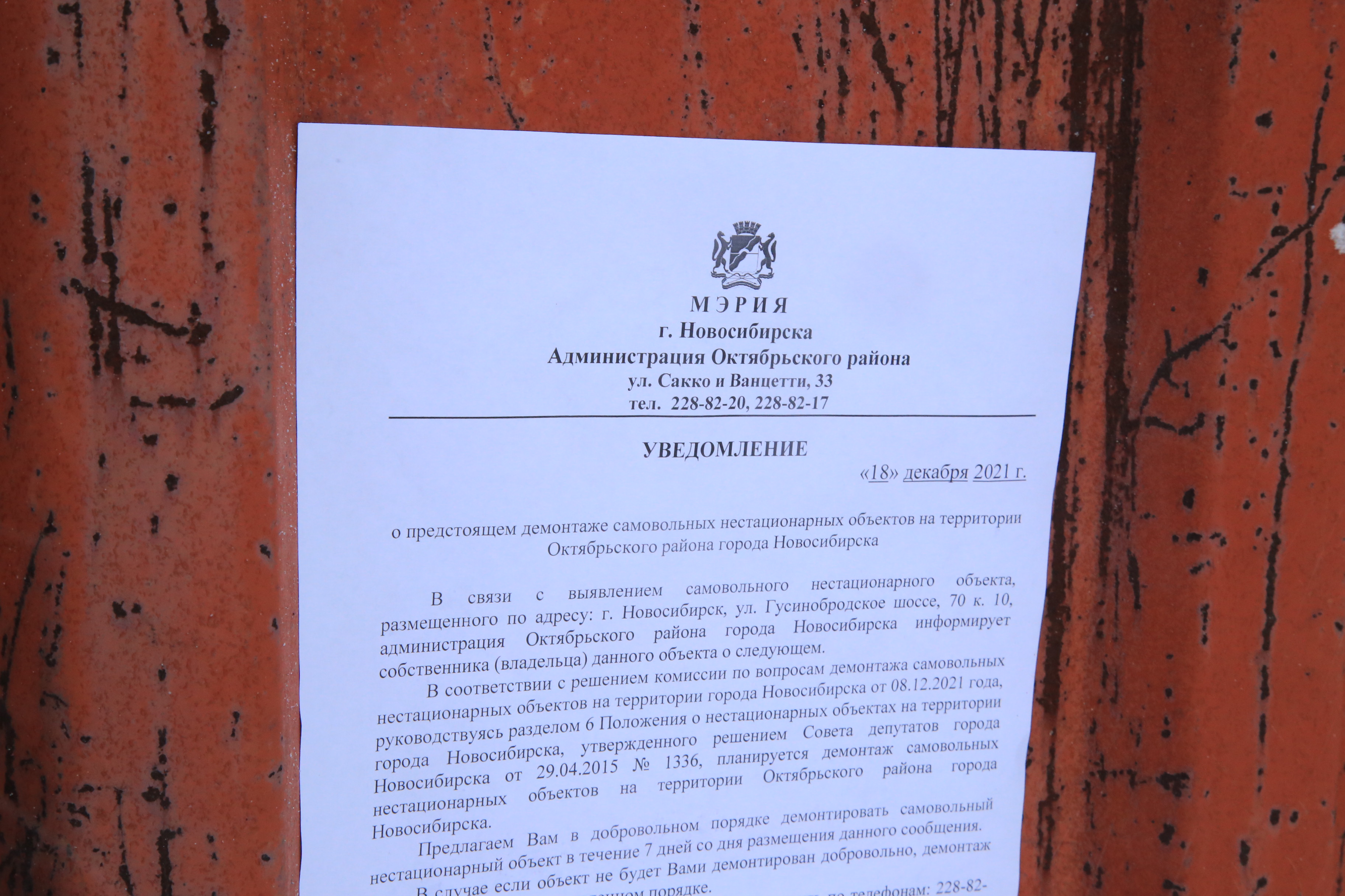 «Комиссией города Новосибирска было принято решение о демонтаже этих объектов. Владелец до сегодняшнего дня не установлен, поэтому принимаются меры по принудительному демонтажу. Предполагается, что здесь будут элементы инфраструктуры. Предполагается, что вся инфраструктура Гусинобродского шоссе и территории, где мы находимся, — это планируемая зона размещения метрополитена», — рассказывает заместитель главы администрации Октябрьского района Новосибирска Яков Чагин.