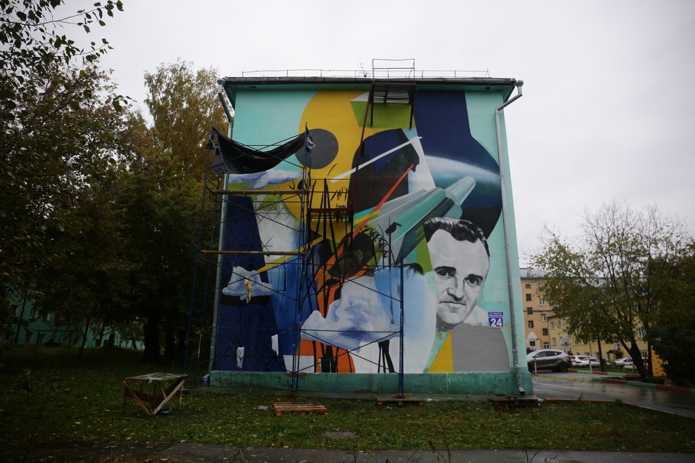 — Это больше касается художников. Да, это была заданная тематика. Но вообще тема космонавтики, космоса, астрономии — чтобы дать им максимально волю. Но ставка была на то, что под этим должна быть научно-просветительская база. И в дальнейшем на каждой росписи будет расположена большая табличка с автором, сжатой информацией и QR-кодом, ведущим на страницу в соцсетях. И там уже будет история о самом человеке, о его открытиях. Всё относительно этого мурала.