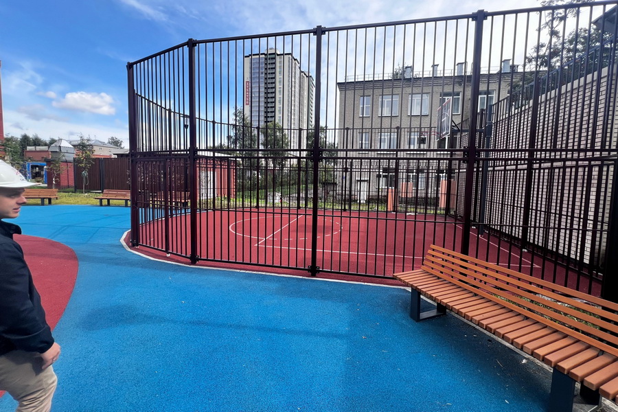 Территорию рядом с высоткой благоустроили: оборудовали игровую и спортивную площадки, засеяли газон, высадили кустарники. Для маломобильных жильцов сделали пандусы. Есть во дворе и небольшой фонтан.