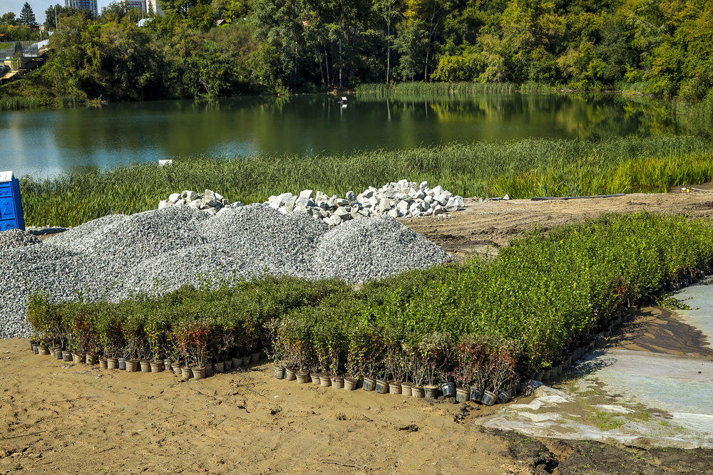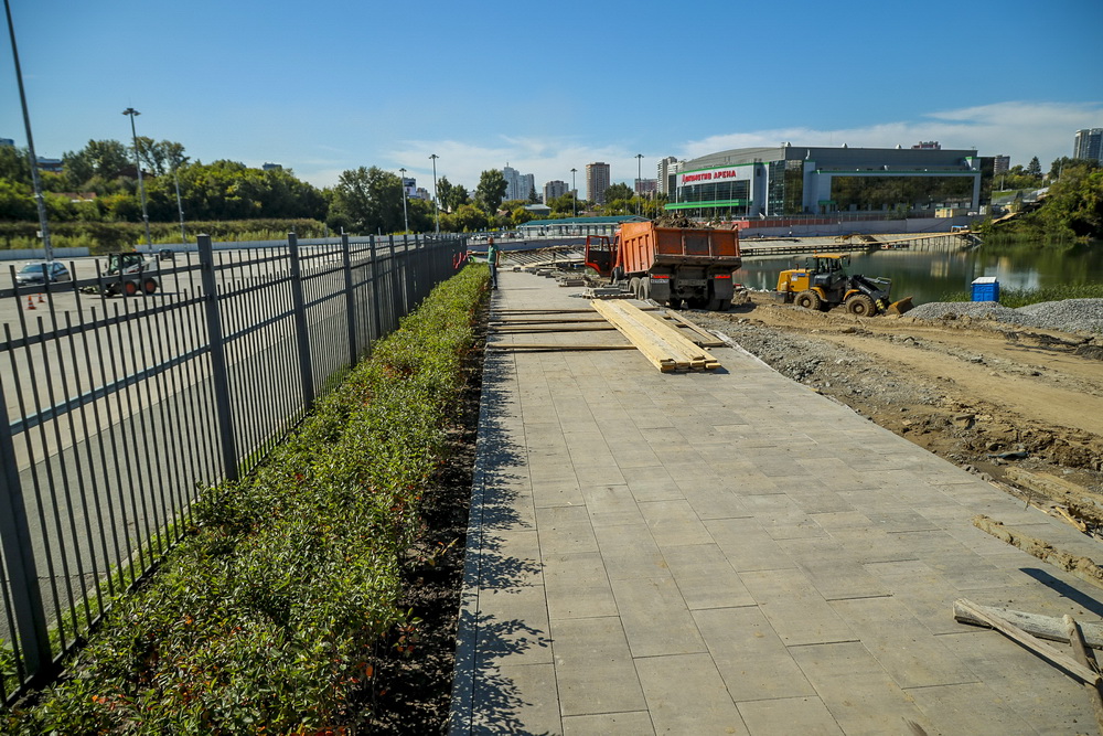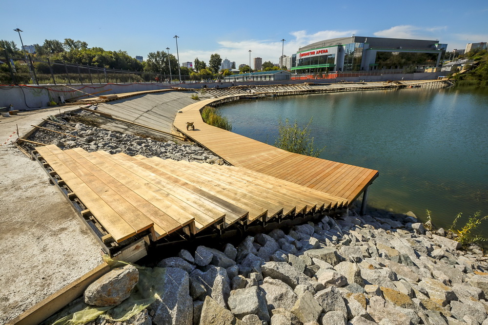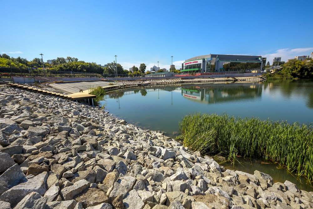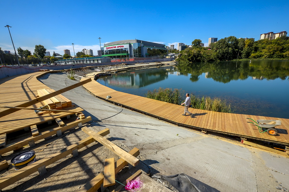 Сейчас на набережной укладывают газон, строят помосты и пирсы, укрепляют откосы, обустраивают пешеходные зоны и волейбольные площадки, монтируют лестничные спуски. Вдоль ограждения высадили декоративные кустарники, проложили тротуары. На водной глади уже появились домики для уточек.