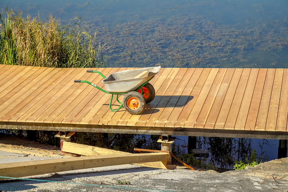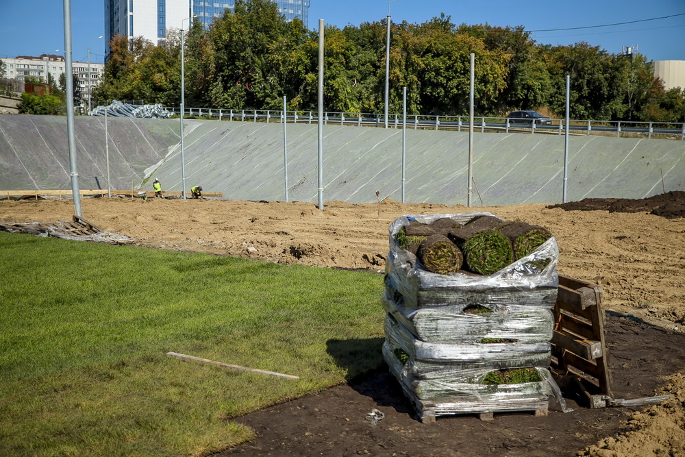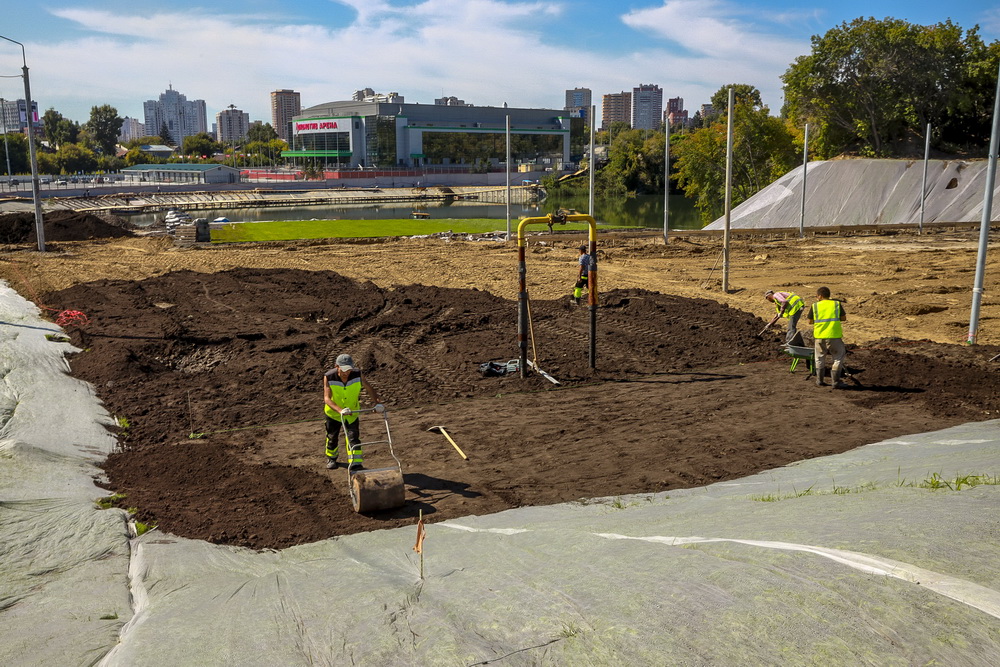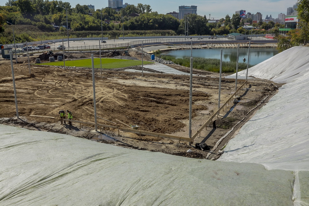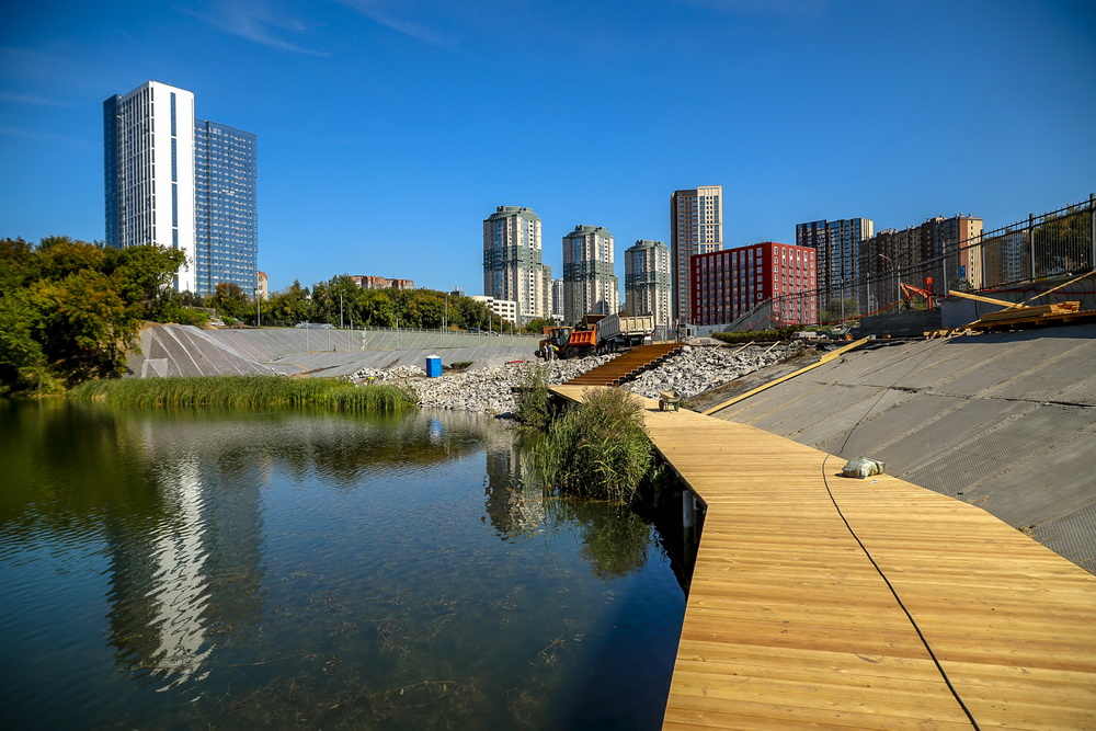 Сейчас на набережной укладывают газон, строят помосты и пирсы, укрепляют откосы, обустраивают пешеходные зоны и волейбольные площадки, монтируют лестничные спуски. Вдоль ограждения высадили декоративные кустарники, проложили тротуары. На водной глади уже появились домики для уточек.