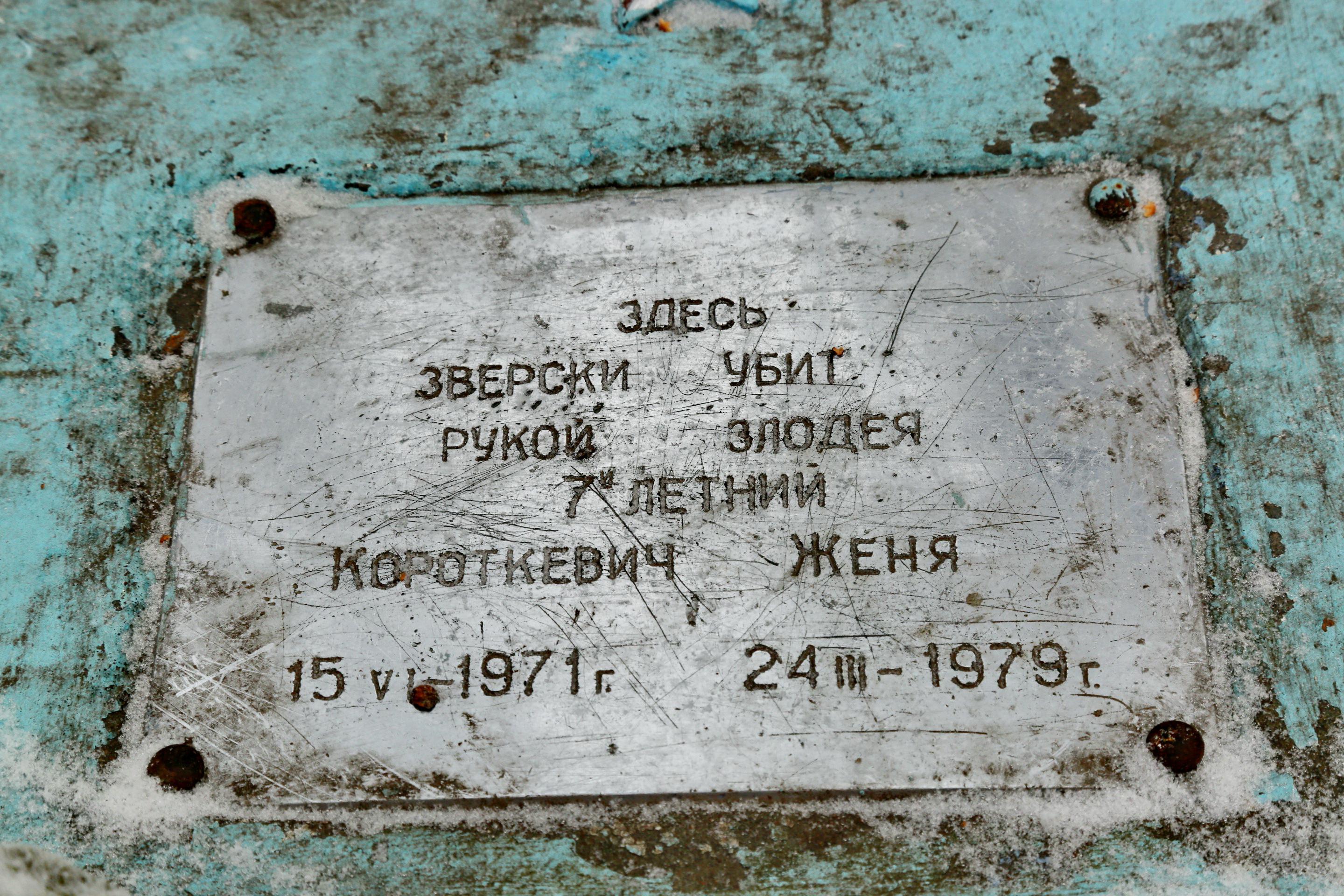 На месте страшной находки семья погибшего мальчика установила памятник. На табличке написано: «Здесь зверски убит рукой злодея семилетний Короткевич Женя». Сбоку прикрепили его портрет. Но лица на нём не видно. Какие-то вандалы расстреляли табличку из пневматического оружия. Новую с портретом поместили сверху.