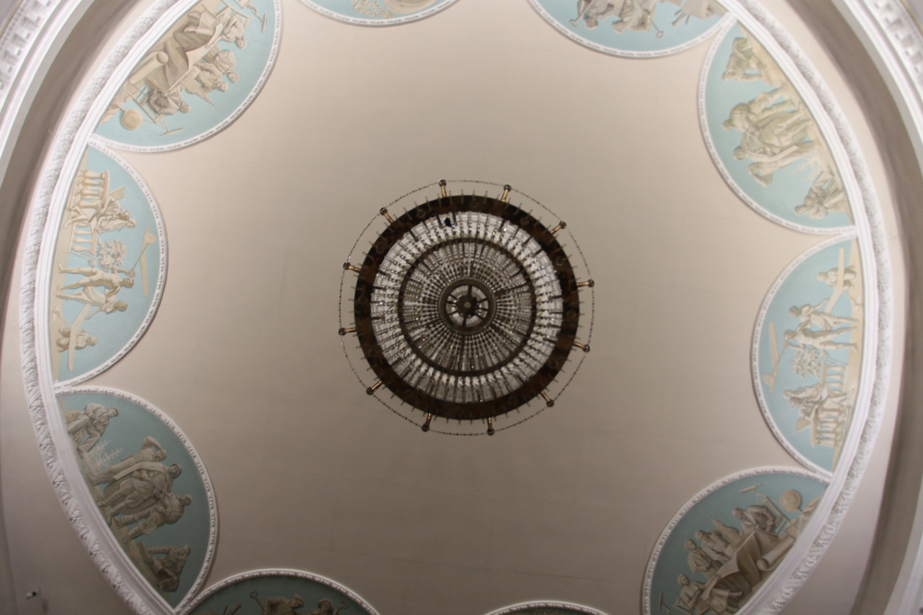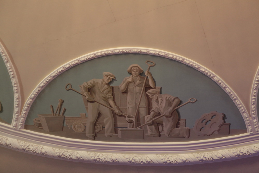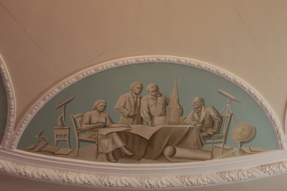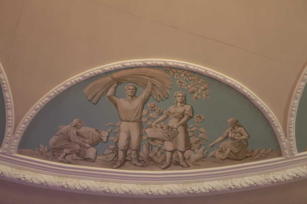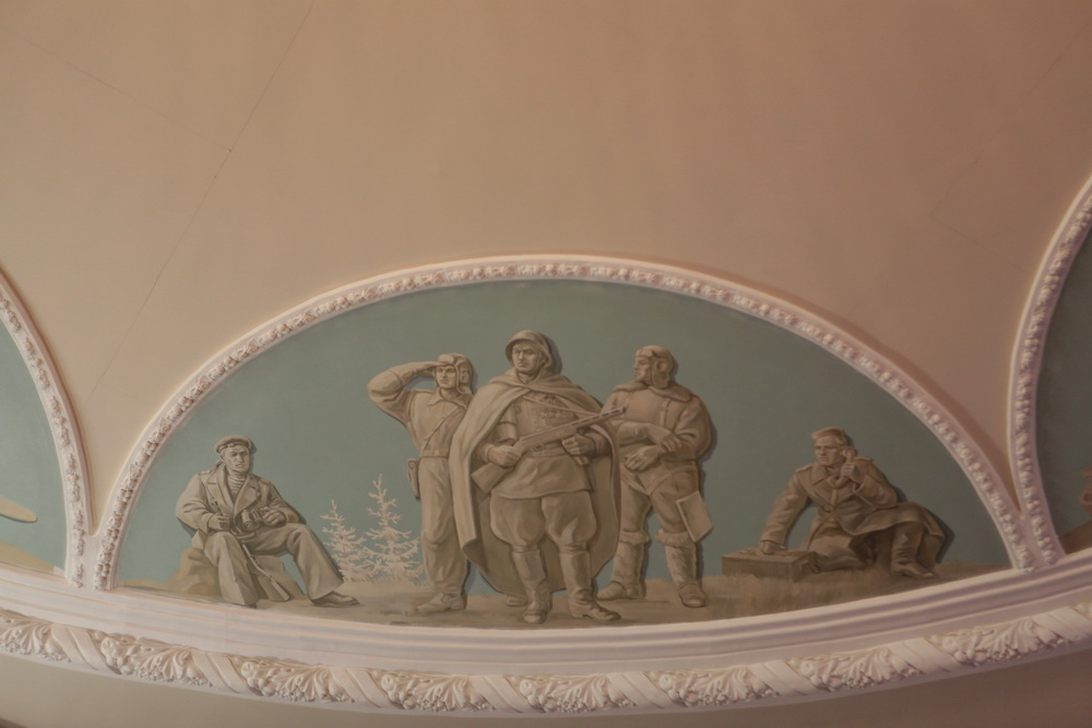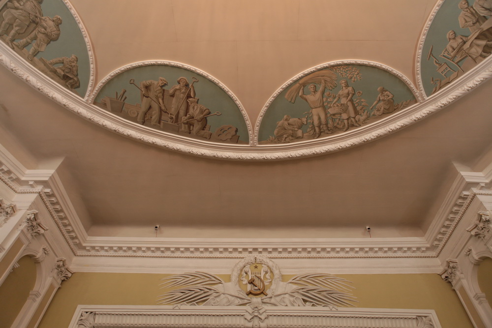 В центре потолка — большая лепная розетка, а по периметру размещены десять выполненных на холсте живописных медальонов полукруглой формы с дублирующимися сюжетами: детство, промышленность, вооружённые силы, наука, сельское хозяйство. Авторы изображений — художники В. И. Чуванов, А. А. Бертик.