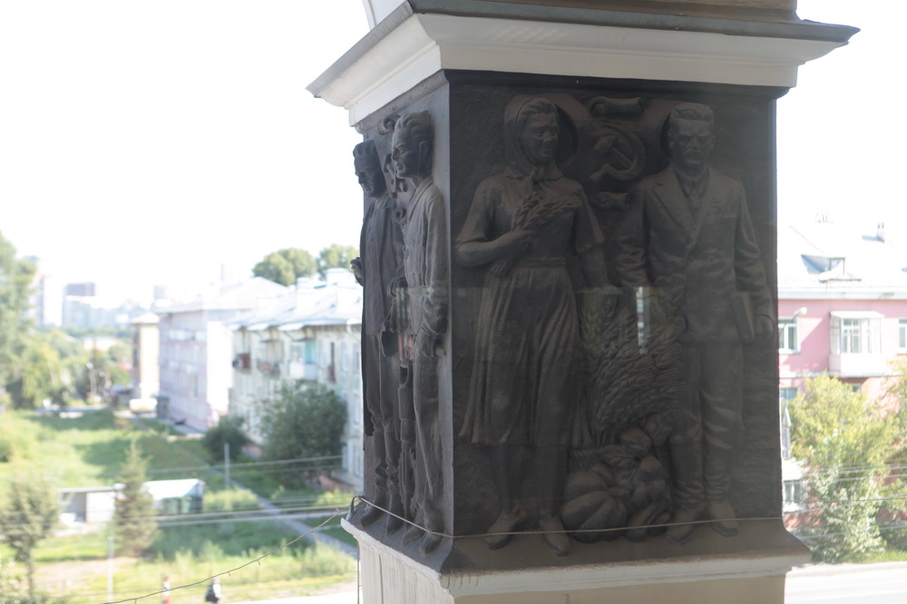 Вершины пилонов и пилястры на стене главного фасада украшены чёрными барельефами. Аналогичные есть у здания ДК «Энергия». Это четыре чередующиеся композиции, на которых представлены люди разных профессий.