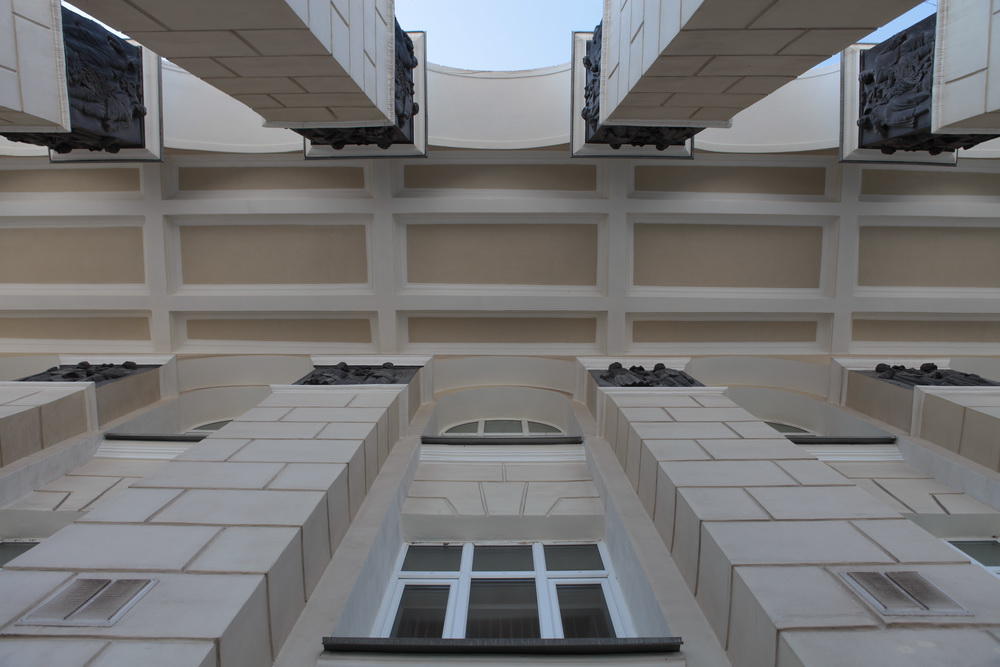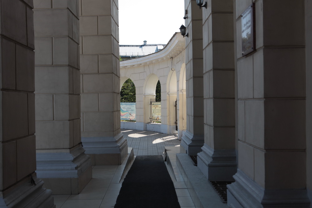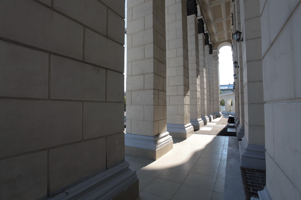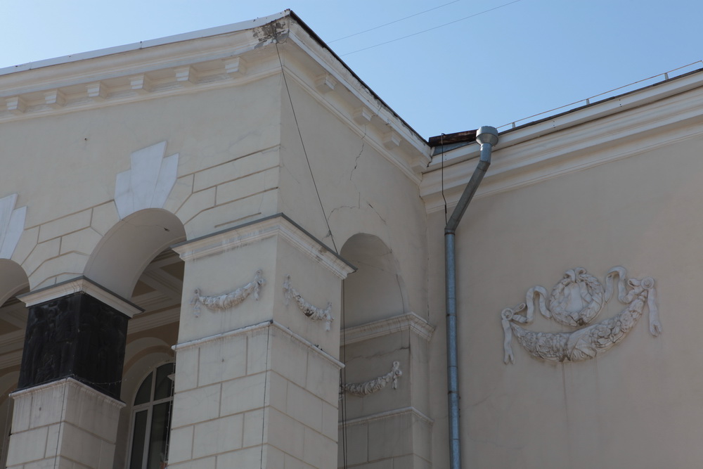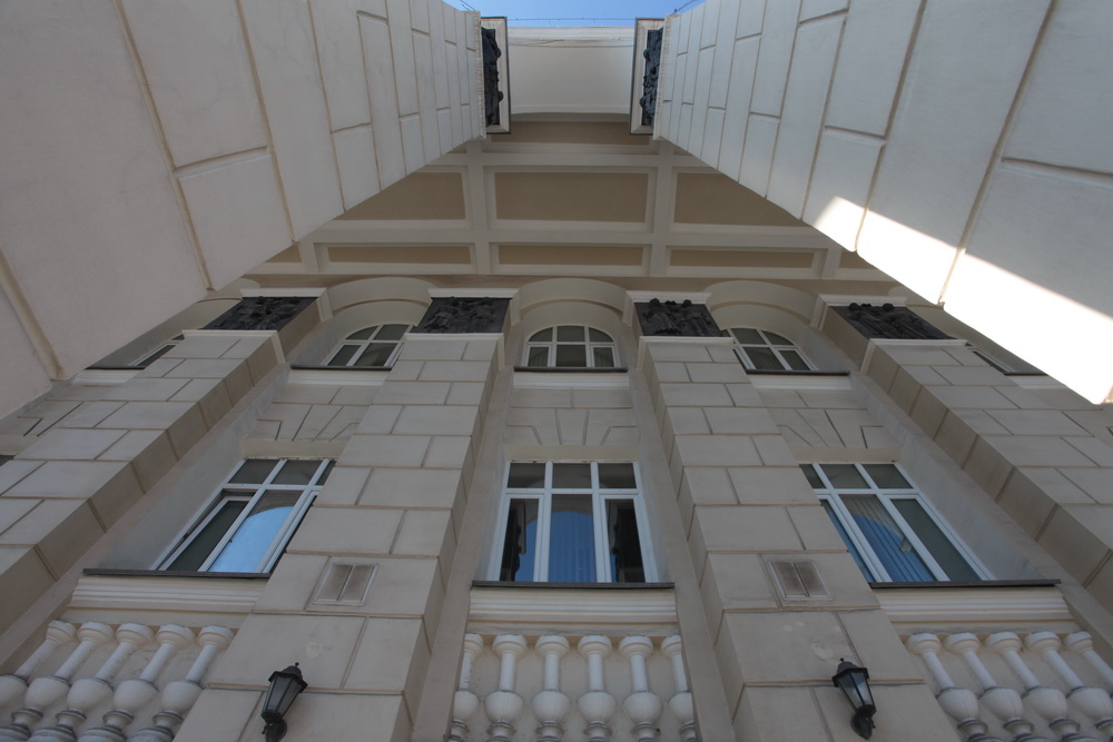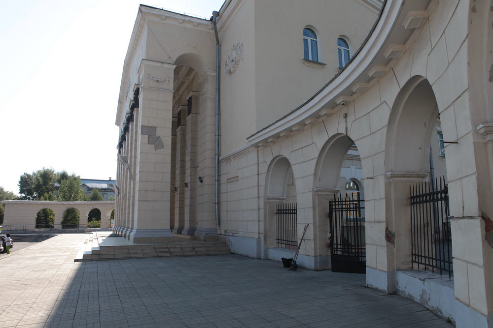 Неподготовленного человека, попавшего на улицу Мира случайно, вид здания может поразить. Композиция главного фасада состоит из портика в три этажа из восьми квадратных в сечении массивных пилонов, рустованных на всю высоту, и аркады, также рустованной, которая двумя крыльями формирует площадь. На пилоны опираются небольшие декорированные клинчатым рустом арки-перемычки и фронтон с карнизом. Конёк крыши венчает акротерий — скульптурная композиция с лирой, чашей и серпом-молотом.