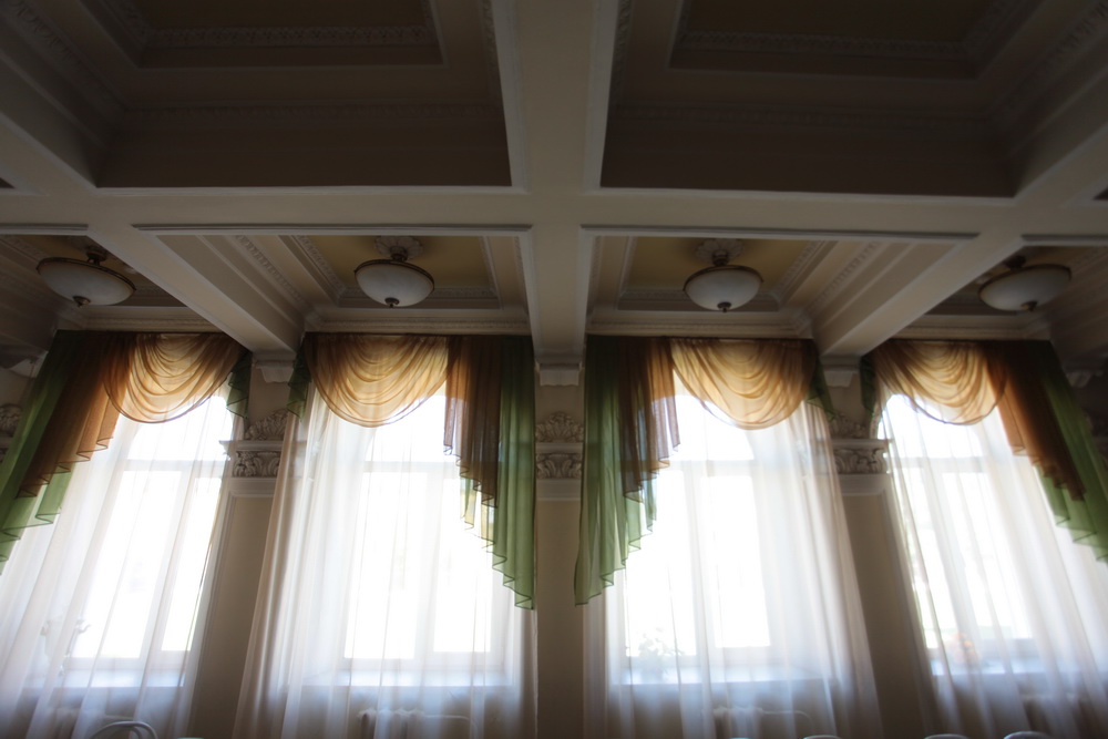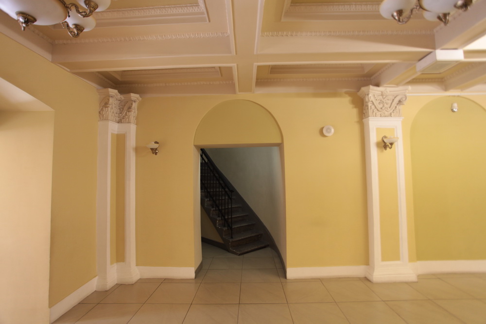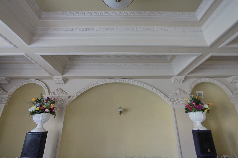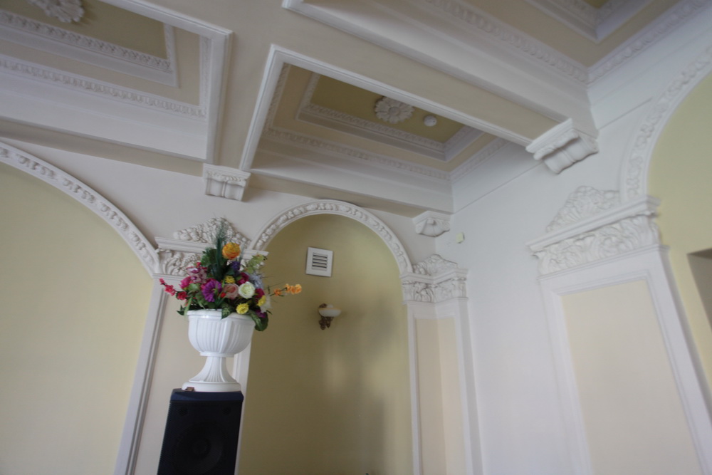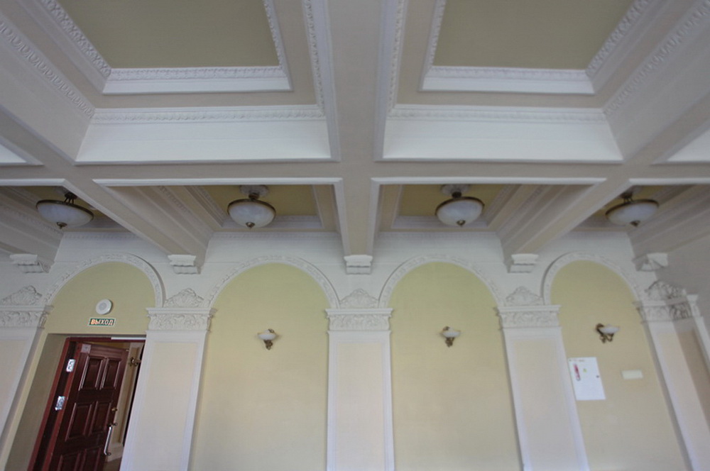 В других помещениях ДК тоже можно увидеть сохранившуюся красоту: потолки с кессонами и лепниной, розетки и карнизы, колонны и пилястры.