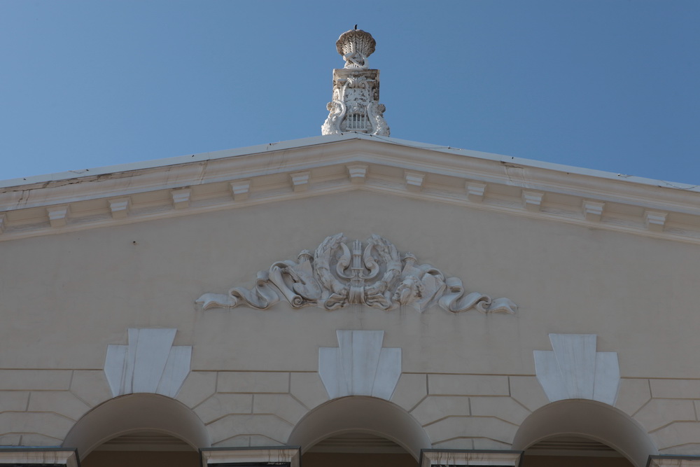 Два крайних пилона и пилястр украшены лепниной в форме цветочных гирлянд. Такие же расположены на плоскости стен, фланкирующих портик. Фронтон декорирован рельефом с изображением символов искусства.