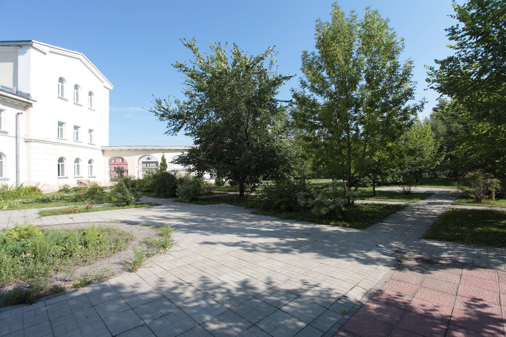 Рядом со зданием обустроили полноценный сквер. Сначала его очистили от разросшихся клёнов, а затем высадили молоденькие дубы, рябины, липы и ёлки, разбили цветники. За 15 лет деревья выросли и превратили это место в настоящий лес.