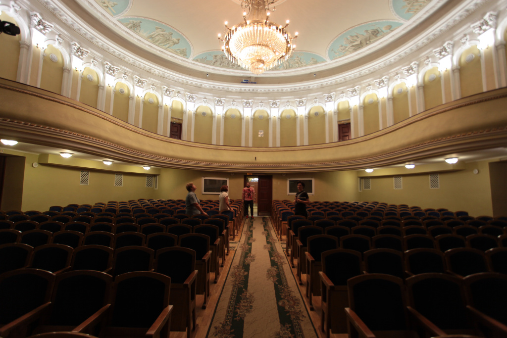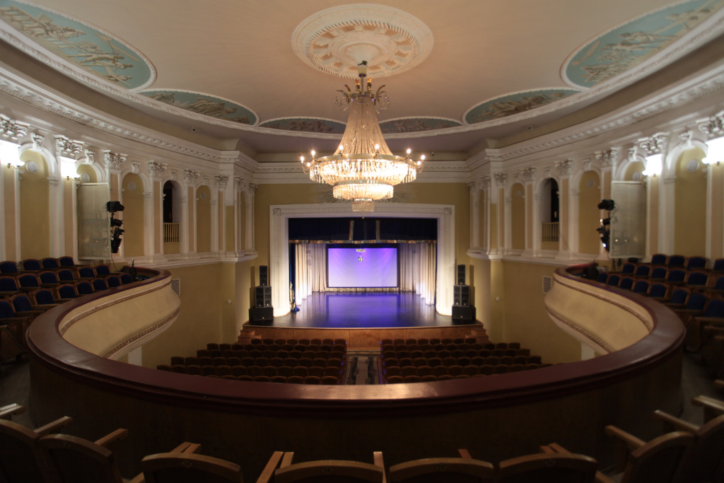 Зрительный зал с большим изогнутым балконом вмещает 425 человек. Ранее помещение было рассчитано почти на 500 зрителей, но часть кресел пришлось убрать, чтобы построить рабочие места для осветителя и звукорежиссёра.