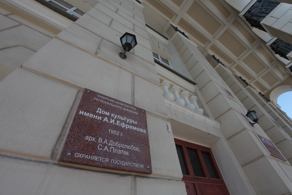 Тогда же отреставрировали лепной декор и потолочные фрески в зрительном зале. В 2010 году ДК Ефремова признали памятником архитектуры регионального значения и взяли под охрану.